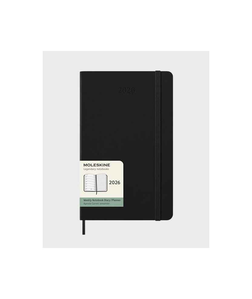 Agenda Moleskine 2026 model Large setmana vista amb tapa dura negra. Pàgina esquerra per planificador setmanal i pàgina dreta amb fulls ratllats per anotacions. Inclou tancament amb goma, cinta marcadora, adhesius, butxaca interior i obertura de 180 graus. Mides: 13 x 21 cm.