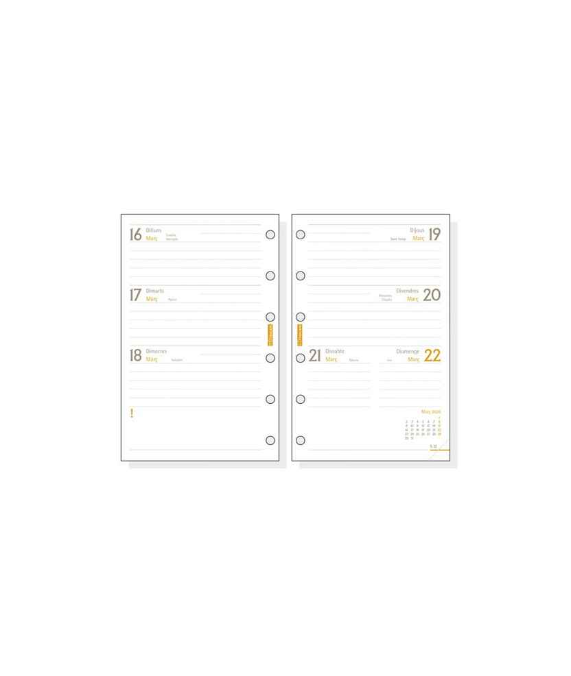 Recanvi anual d'agenda Finocam Classic 2026 vista setmanal horitzontal en català. Amb cantonades microperforades per localitzar ràpidament el dia o la setmana en curs i informació d'interès. Mides: 73 x 114 mm.