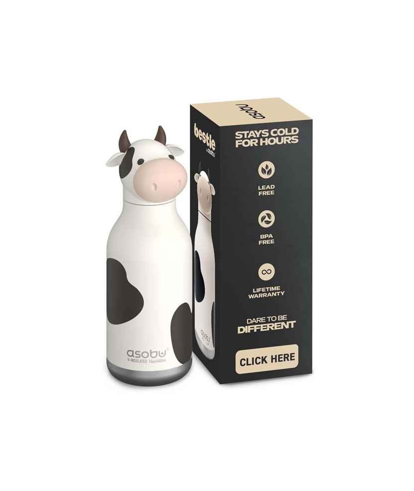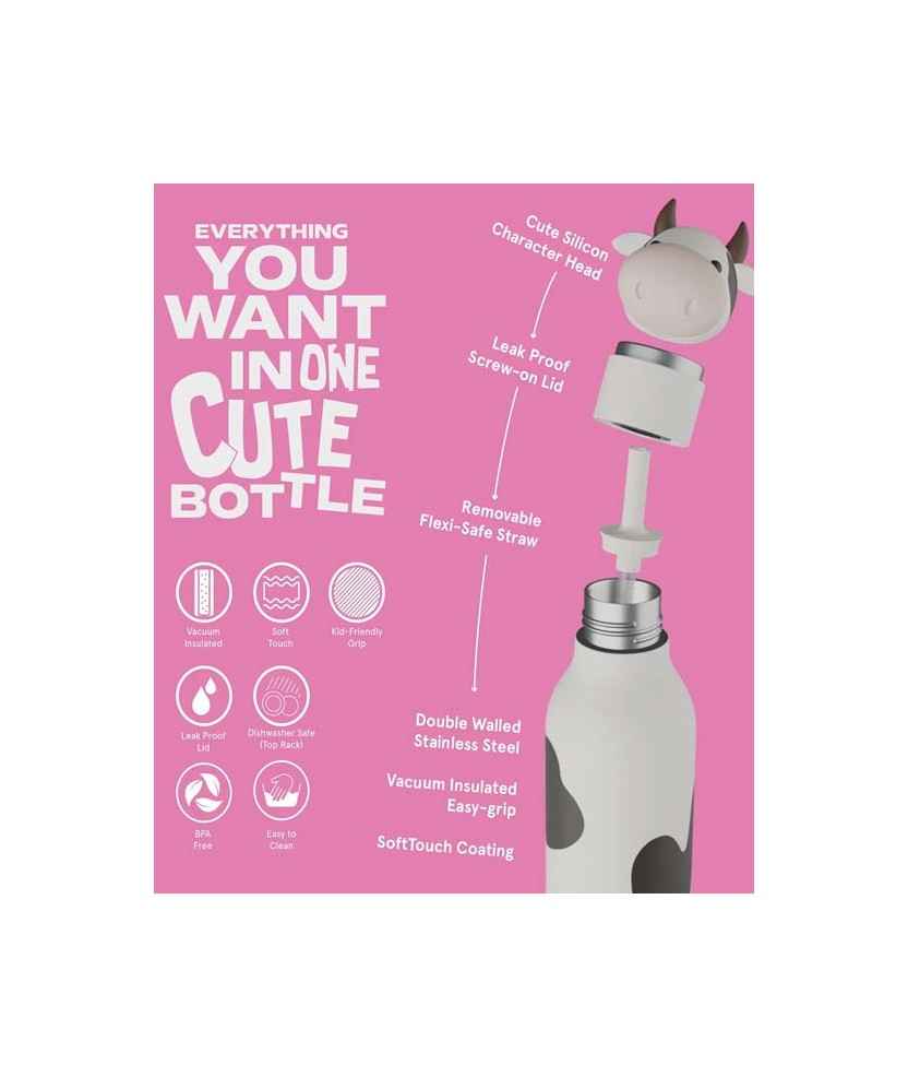 Ampolla isotèrmica infantil d'acer inoxidable amb paret doble i cambra de buit, que manté les begudes fresques durant hores. Disseny de vaca amb tacte suau, canya integrada segura i obertura ampla per omplir amb aigua, suc o llet. Tapa abatible fàcil d'usar i cos resistent per a l'escola o sortides. Producte pràctic i durador, apte per a ús diari. Capacitat: 475 ml.