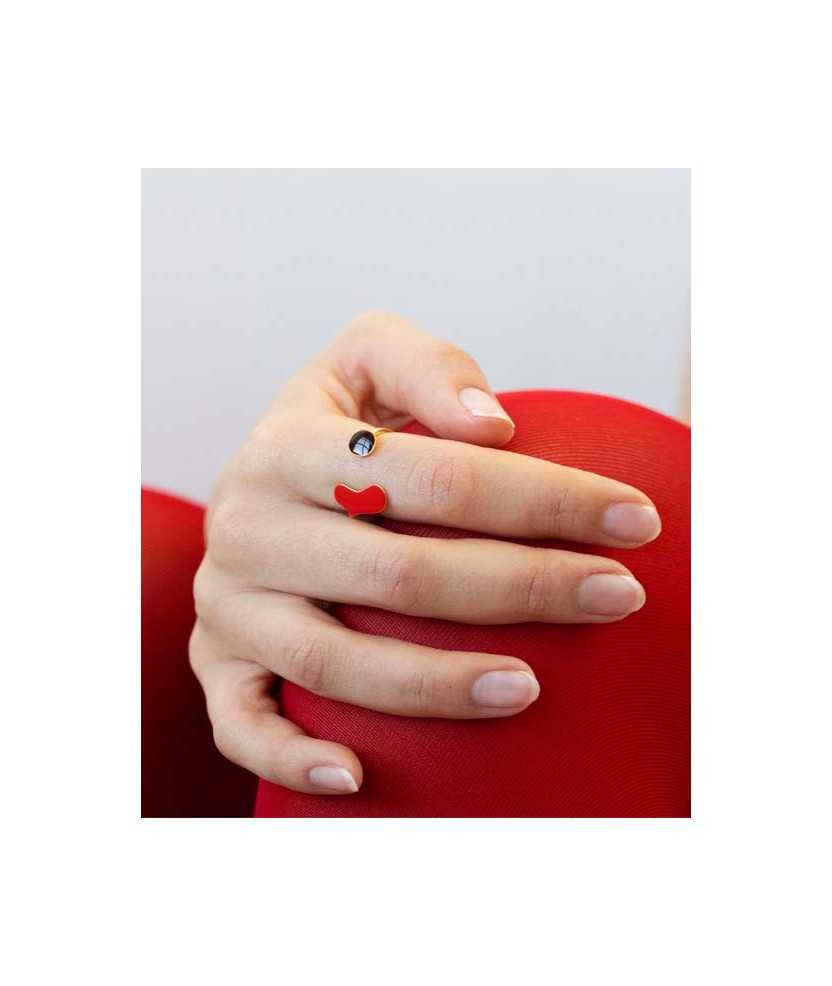 Anell daurat en forma de cor amb esmalt en tons vermell i negre. Peça inspirada en l'obra Sans titre de Joan Miró, de l'any 1925, que destaca per les seves formes expressives i contrast cromàtic. Confeccionat en llautó amb bany d'or de 24 K, presenta un acabat acurat i equilibrat que combina disseny artístic i qualitat material pròpia de la joieria contemporània.