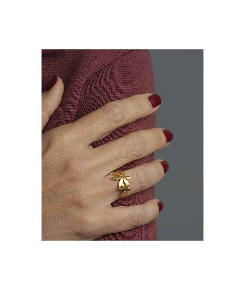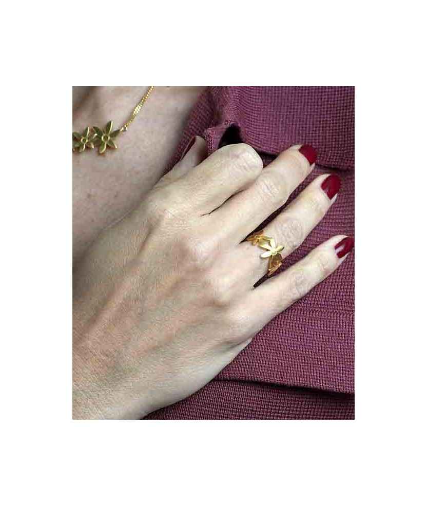 Anell amb tres flors de plata de 925 mm amb bany d'or groc de 18 k, on la flor central és més gran que les laterals. Inspirat en la flor del safrà, símbol de bellesa i del seu preuat or vermell. Joia artesanal dissenyada i produïda a Barcelona. Flor central de 13 mm d'alt.