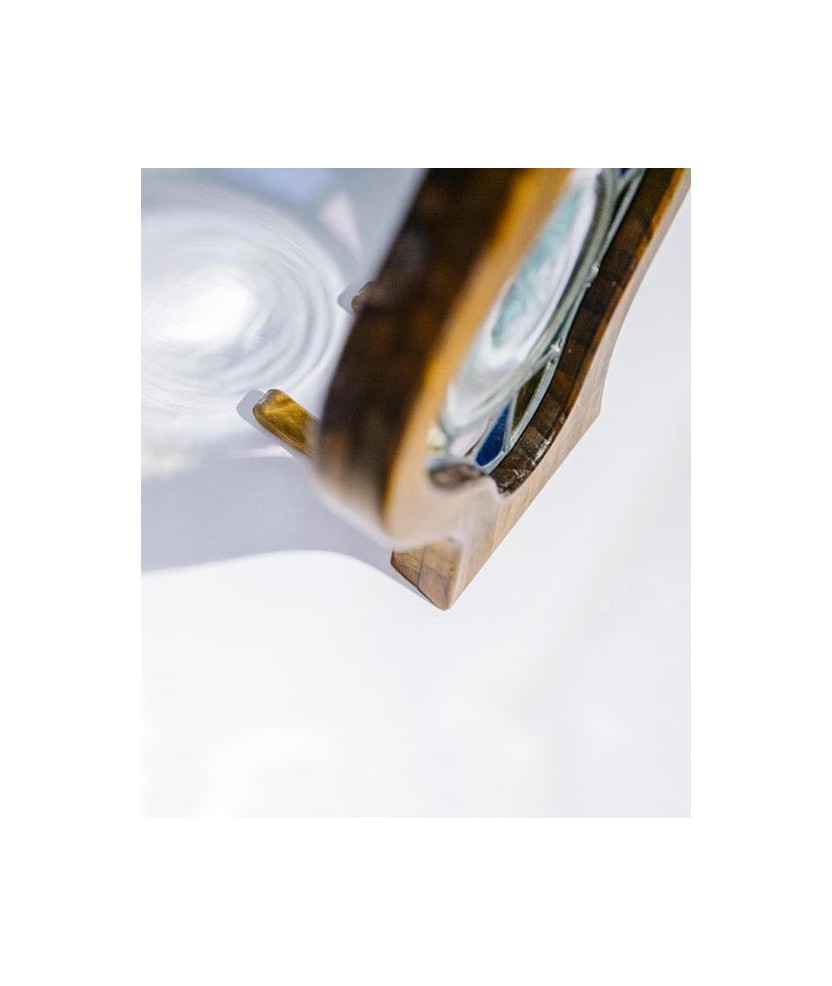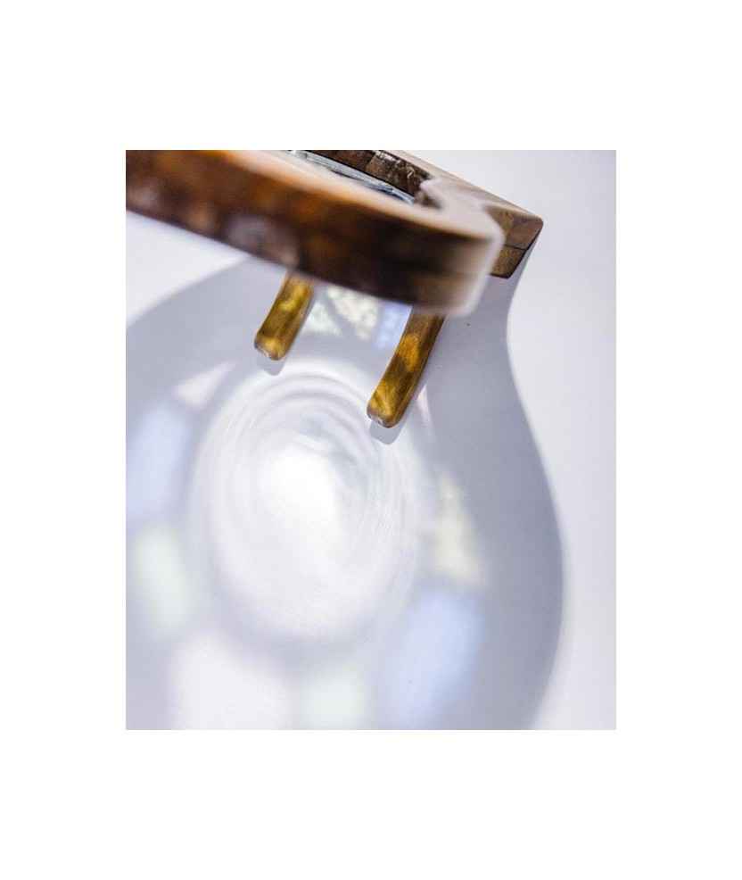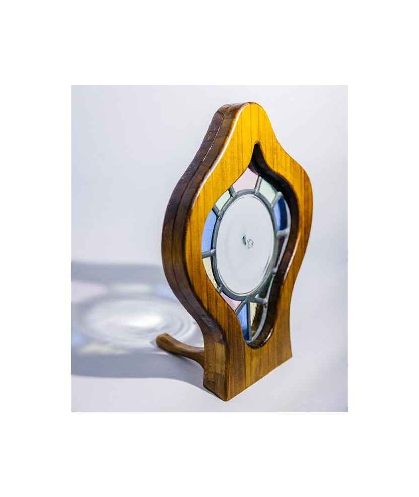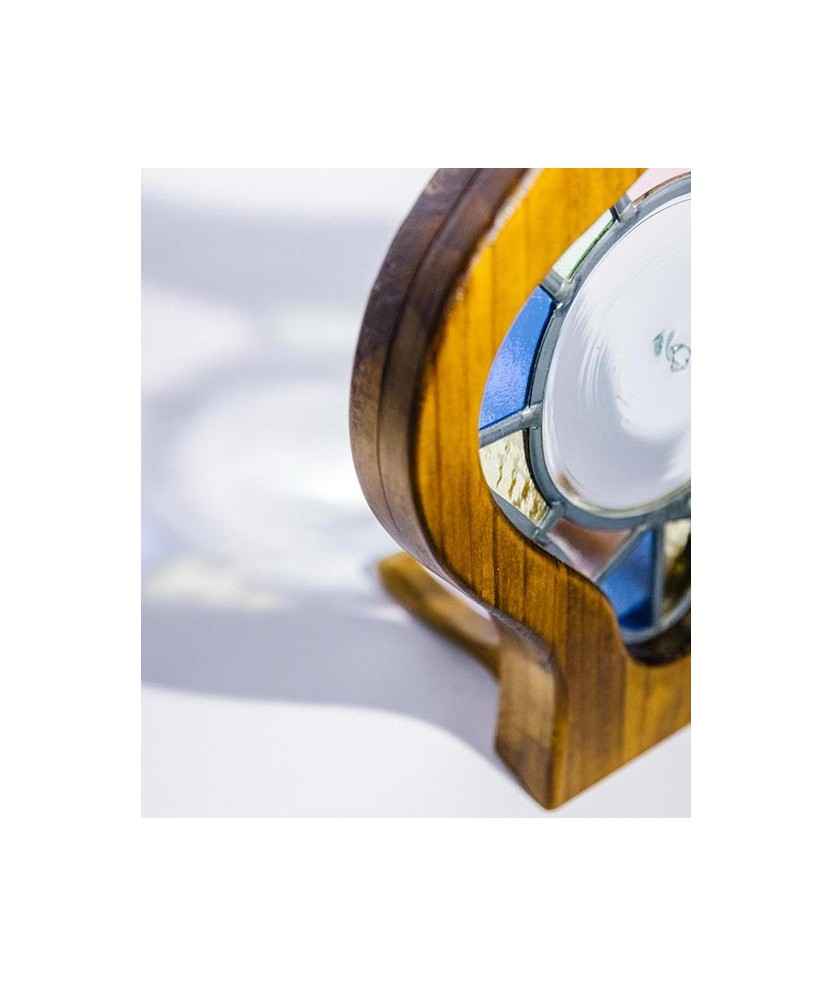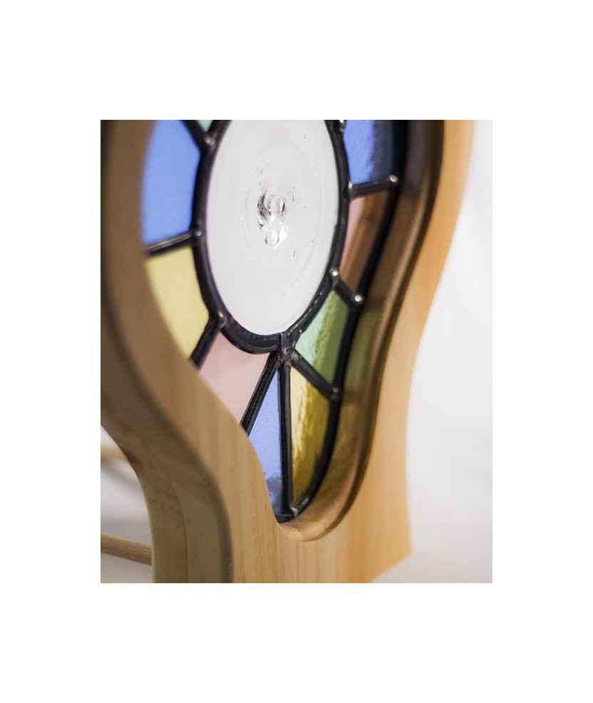 Reproducció d'un dels vitralls interiors de la Casa Batlló. Creat per Fusteria Digital i Can Pinyo-naire Vitralls amb la intenció d'aportar un producte exclusiu realitzat amb la mateixa tècnica i materials tradicionals. Cibes i vidre catedral bufat manualment. Marc de fusta de pi tractada amb goma laca i cera. Peça única.