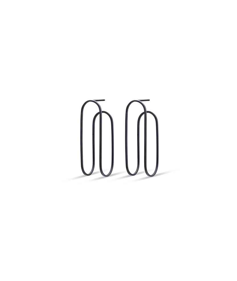 Arracades de plata 925 oxidada. Realitzades a mà per Berta Sumpsi. El seu llenguatge es carateritza per l'ús de gestos i elements mínims, les seves peces són exercicis persistents entorn a una forma, material o concepte. Sumpsi entén la joieria com un àmbit de la creació actual on es poden entrecreuar amb llibertat l'art, el disseny, l'artesania i la moda. Mides: 1x4x1 cm.