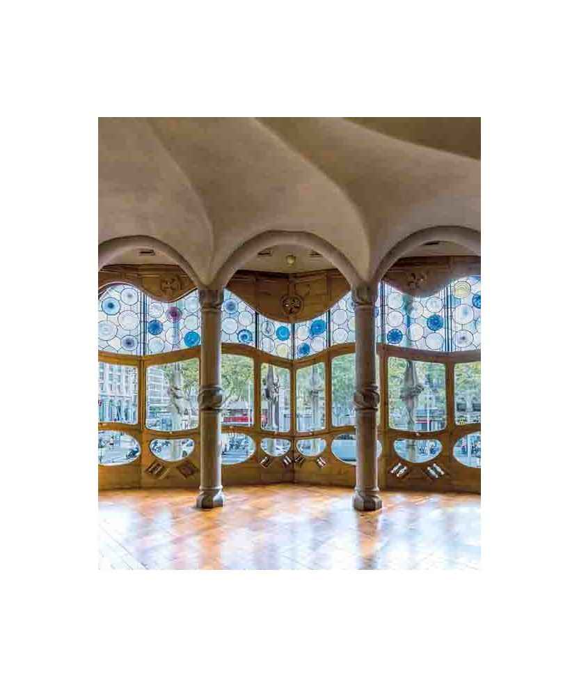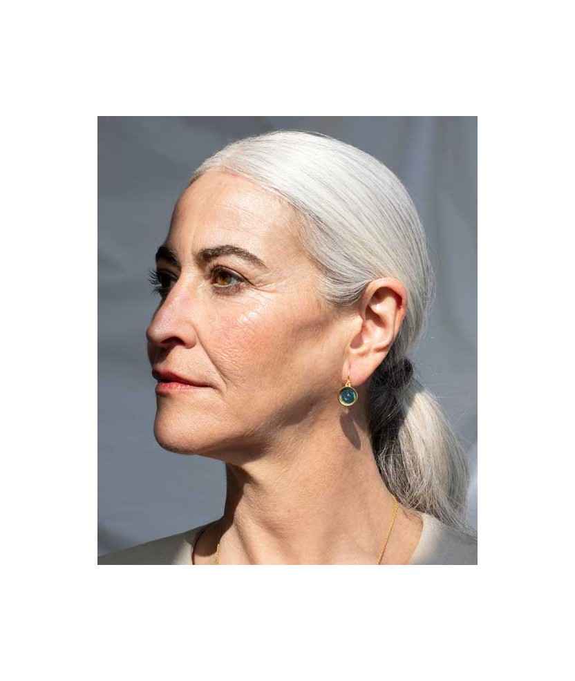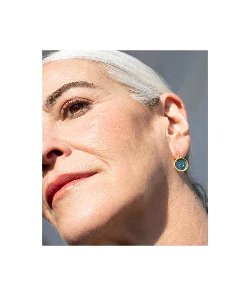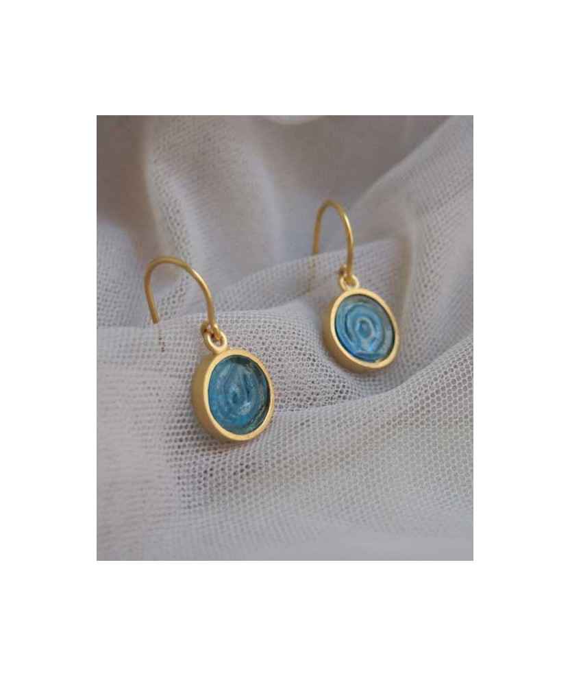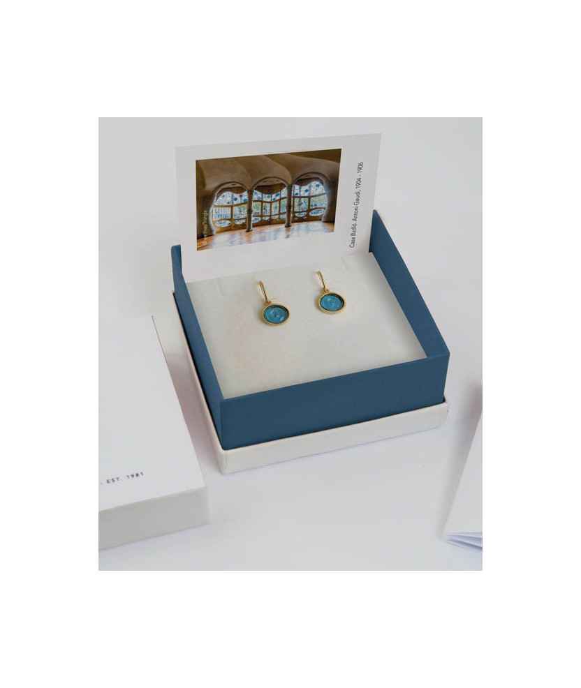 Arracades rodones petites i mòbils en metall mat daurat amb bany d'or de 24 K i vitrall de vidre de Murano artesà en blau intens. Disseny inspirat en la vidriera de la Casa Batlló, obra de l'arquitecte Antoni Gaudí (1904-1906). Ganxo amb topall de silicona.