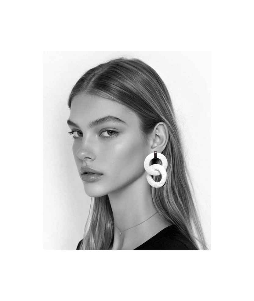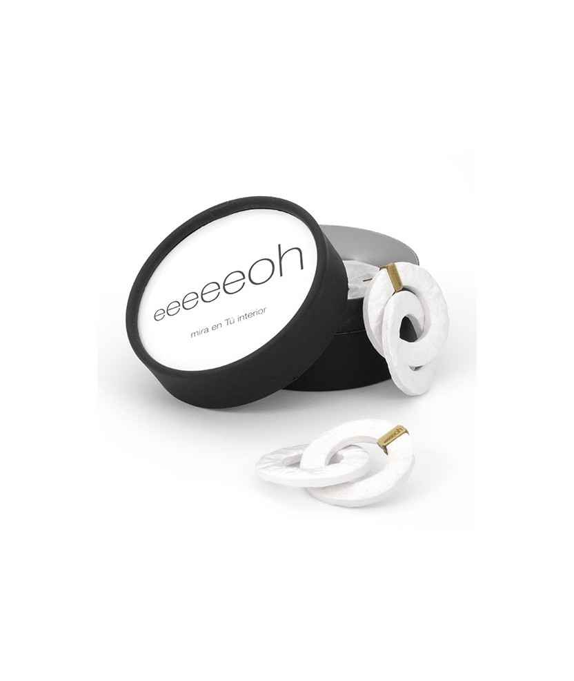 Model 33, arracada de forma circular, mida gran i color blanc. Eeeeeoh és més que una arracada: és un codi d'inclusió fet amb material reciclat i ecològic, creat per persones amb diversitat funcional a LaFact. Inspirada en la geometria essencial de la Bauhaus i la filosofia de la Gestalt, aquesta peça molt lleugera (menys de 3 g) connecta amb la bellesa interior i l'equilibri personal. Inclou tanca hipoal·lergènica per a una millor adaptació i comoditat.