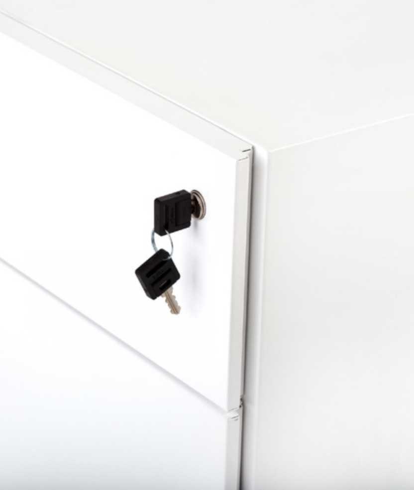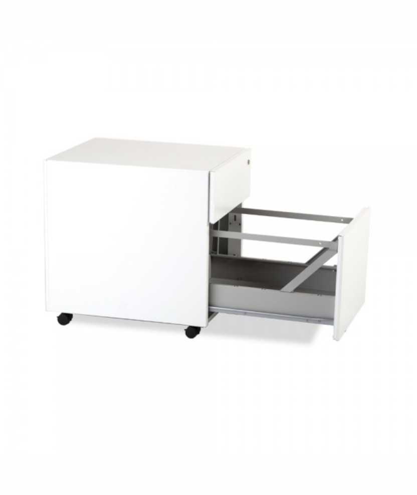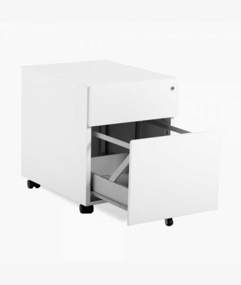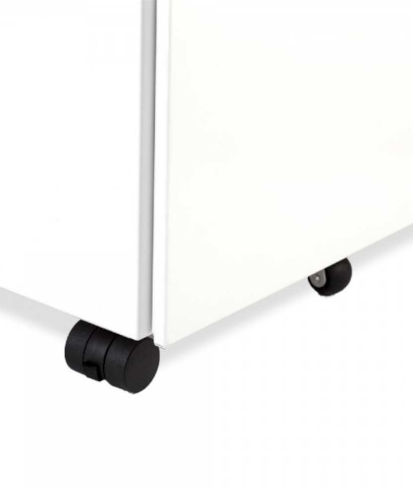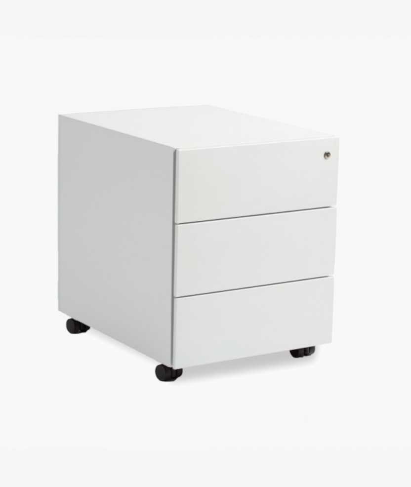 Calaixera metàl·lica de línies suaus i modernes amb tres calaixos. Incorpora guies, tanca centralitzada amb dues claus i sistema antigir. Estructura i calaixos en planxa metàl·lica pintada epoxy de color blanc. Les rodes disposen de sistema de fre per a una correcta fixació. Mides: 43x58x53 cm.