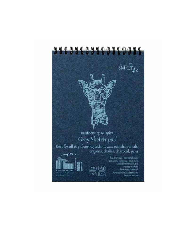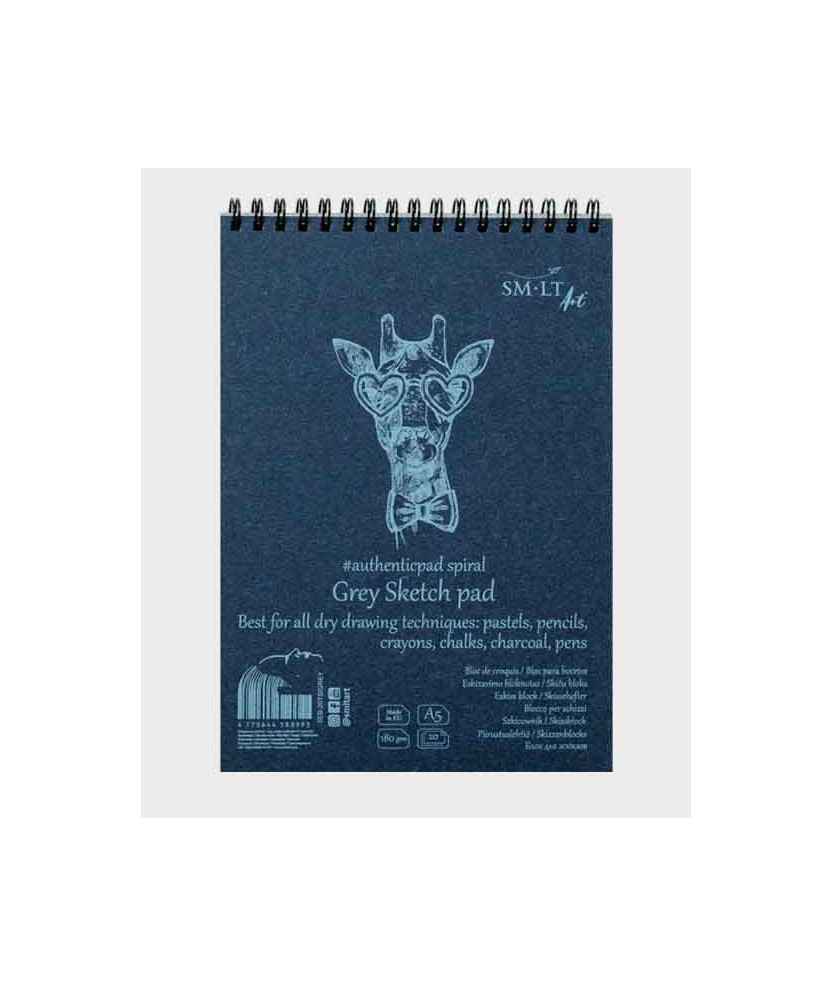 Bloc d'esbossos gris amb paper de 180 g/m² i fibres de cotó que aporten rugositat i volum a la superfície. Ideal per a totes les tècniques de dibuix en sec com llapis, carbonet o pastels. El paper és lliure d'àcids i està enquadernat amb anelles, amb tapa i separador de cartó natural que protegeix les fulles. Mides: A5.
