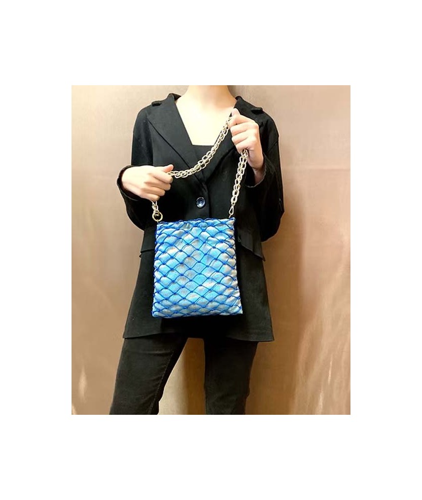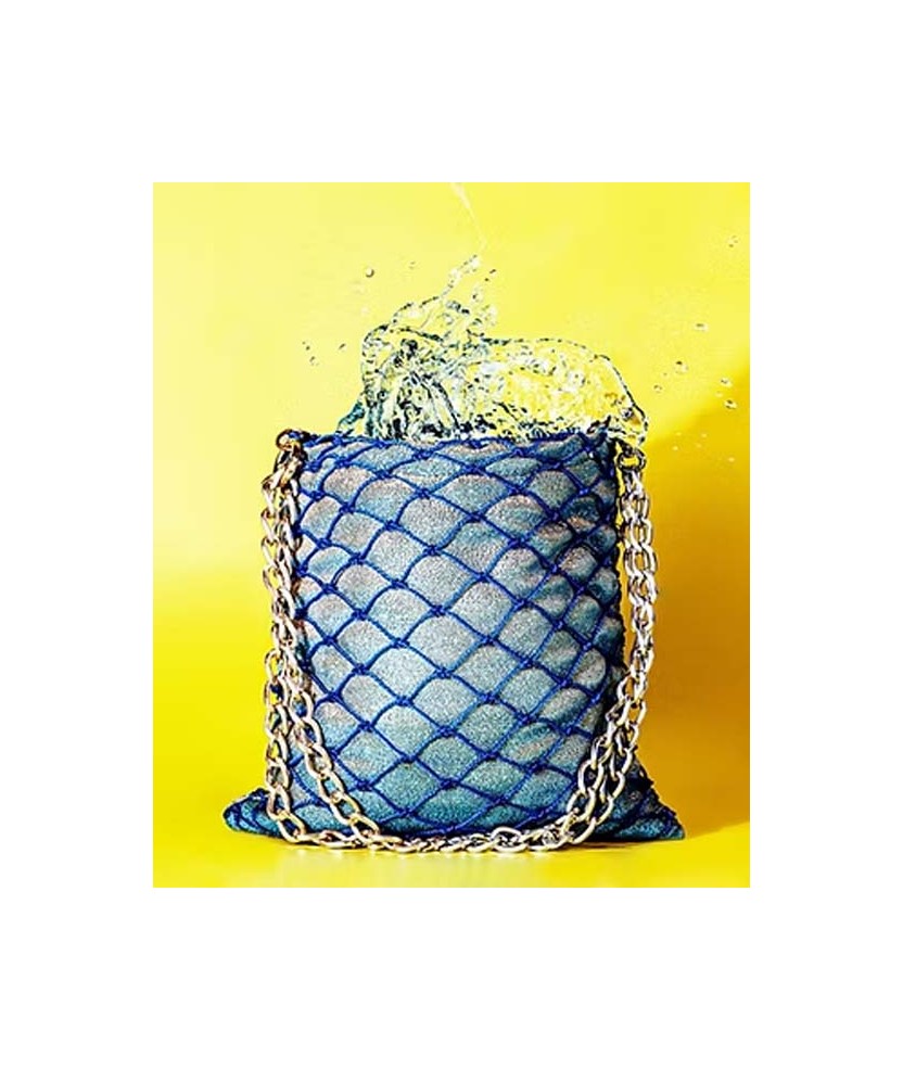 Dissenyada per Alú Alú, aquesta bossa artesanal està feta a mà a Barcelona amb xarxes de pesca reciclades. Combina teixits tècnics com el neoprè 3D, sense pell animal, amb tancament d'imant cosit a mà, cartera interior de plàstic reciclat i cadena d'alumini lliure de níquel. Mides: 22 x 23 cm.