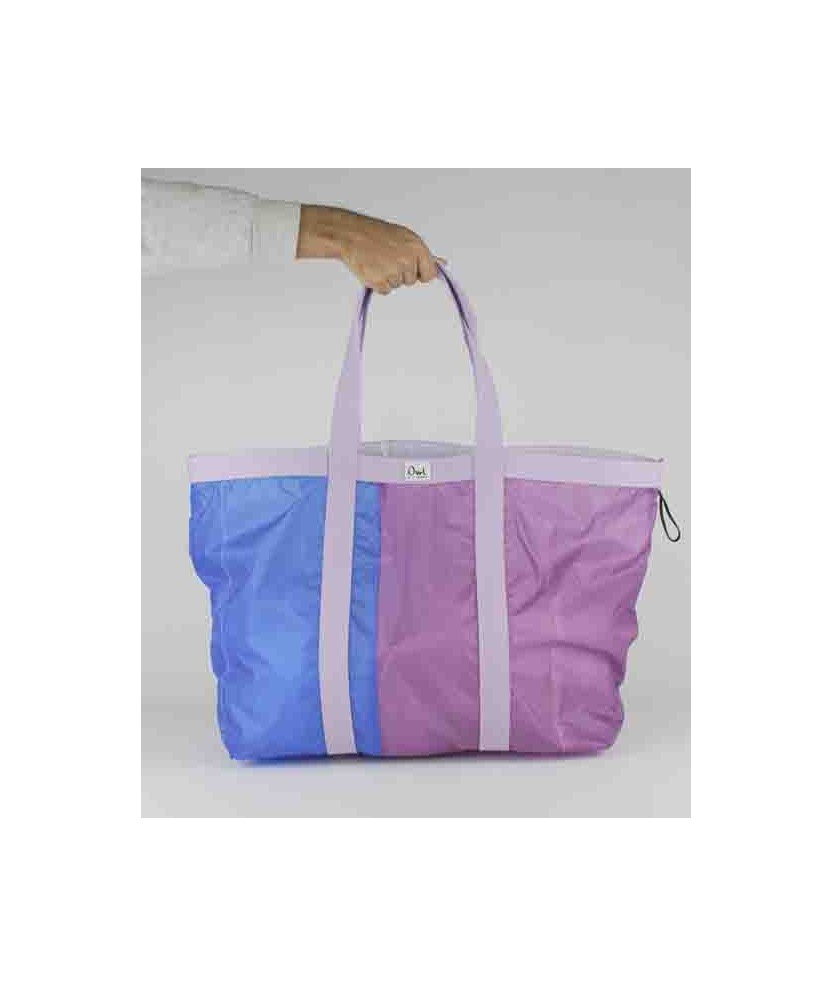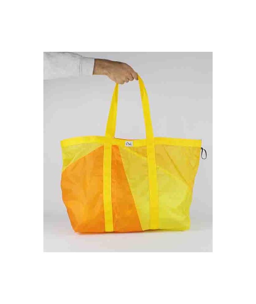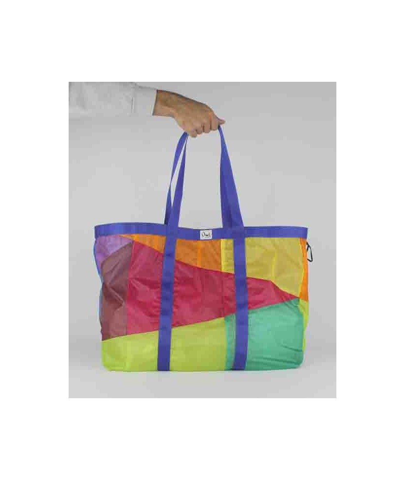 Bossa 'Shopping bag' d'Upcycling confeccionada a partir de veles de parapent reutilitzades i cintes d'exposicions del Disseny HUB Barcelona (les fluor i les blaves). La resta són deadstock d'un proveïdor local. Són peces úniques, això vol dir que tant el color com el disseny variarà respecte a la imatge de referència que es mostra. No hi ha cap bossa igual. Teixit: Exterior Upcycling parapents - 100% niló. Confeccionades a Barcelona. Rentar en fred, no fer servir assecadora, no planxar. Mides aprox: 39cm x 60 cm.