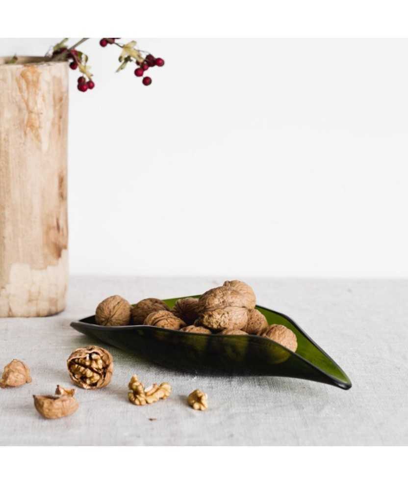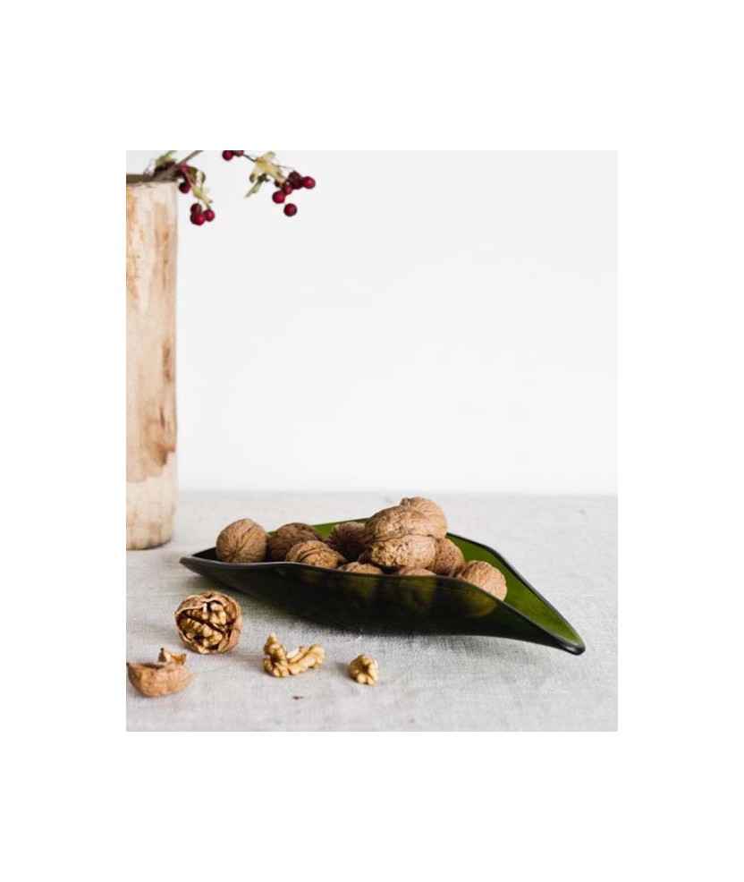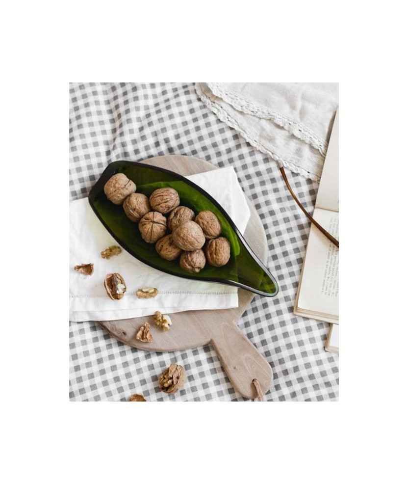 Safata de vidre reciclat artesanal que amb el seu tacte i delicadesa recorda una ploma. Ideal per donar un toc sofisticat als teus plats i aperitius a les teves celebracions. Lucirmás és un atelier que busca l'excel·lència en el disseny sostenible en vidre. El resultat són productes elegants i útils, dissenyats per viure una llarga vida i que s'adapten fàcilment a múltiples espais. A més, és una de les primeres marques de disseny europeu especialitzada en Upcycling d'ampolles de vidre. Apte per a rentavaixelles. Mides: 25x10x3cm.