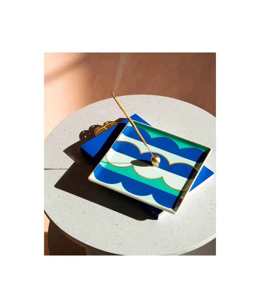 Safata ceràmica d'alta cocció en color blau amb detalls daurats aplicats a mà. Ideal per decorar la taula d'entrada o com a portaobjectes sofisticat al costat del llit. Cada peça inclou una caixa de regal sostenible amb estampació daurada. No apte per a ús alimentari. Es recomana netejar a mà. Mides aproximades: 15,5 x 15,5 cm.