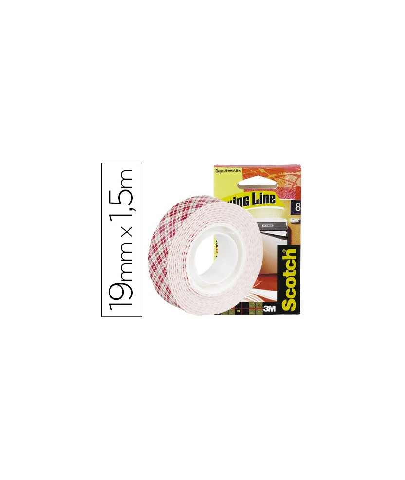 Soporte adhesivo cinta scotch doble cara ultra resistente 1,5 m x 19 mm . Resistente a cualquier temperatura. Soporta 1 kg / 1 tira de 15 cm. Con adhesivo en ambas caras, es ideal para fijar objetos más pesados, como buzones y ganchos sobre superficies lisas y rugosas. Indicada para interior y exterior. Superresistente. Color blanco. Medidas: 1,5 m x 19 mm.