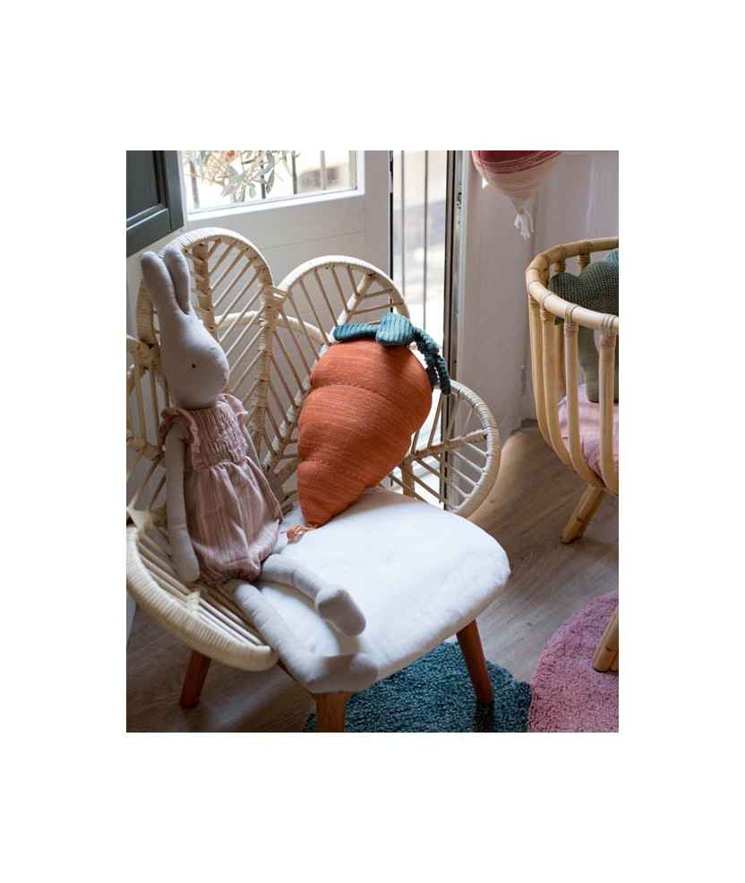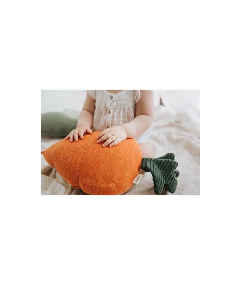 Coixí de punt amb forma de pastanaga. Està teixit en tons ataronjats, creant un efecte degradat. Les fulles verdes teixides a la part superior permeten portar-lo. Compte amb la certificació Oeko-texr. El farcit està compost de Polyfillr i el coixí és rentable a màquina. Fet a mà amb figura natural de cotó. Mides: 25x40 cm.