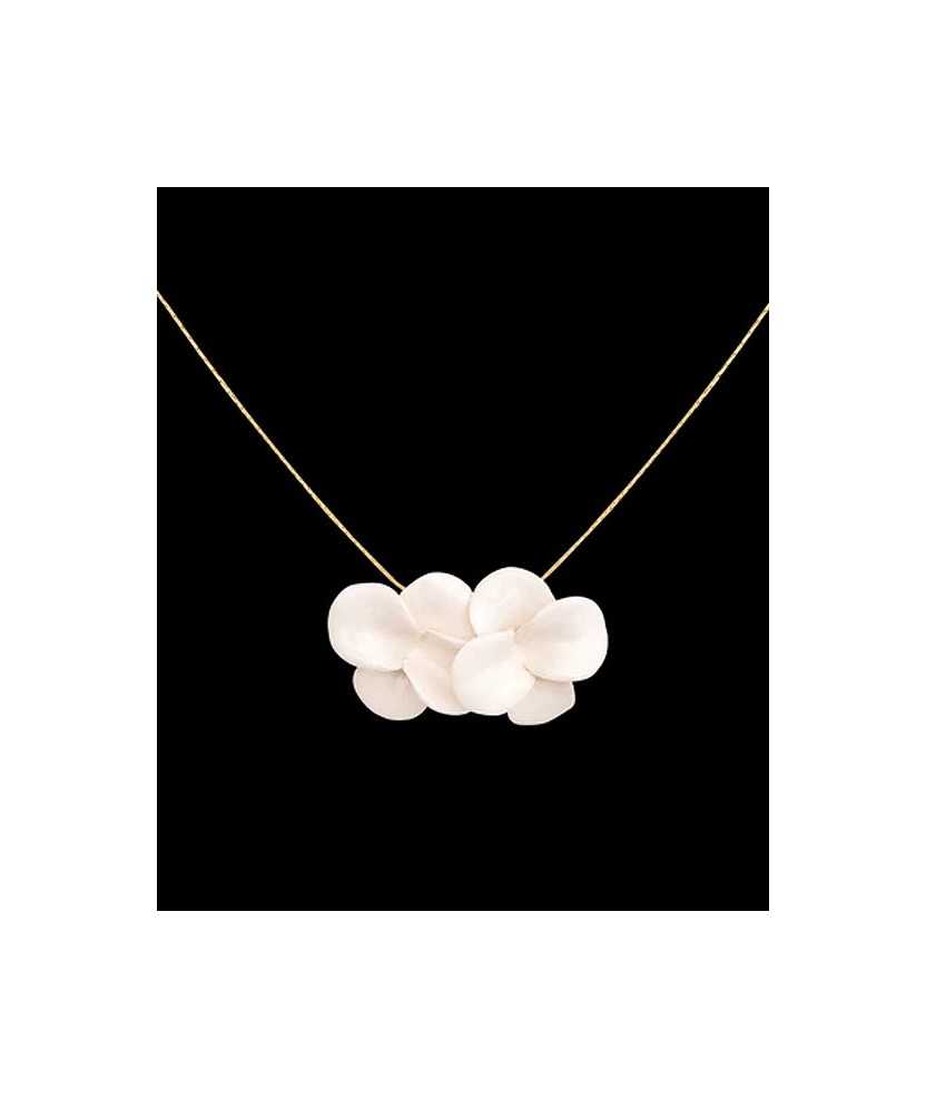 Collaret format per dues peces de ceràmica modelades i esmaltades a mà. Les formes orgàniques i l'acabat artesanal destaquen la delicadesa del conjunt. La cadena és de llautó amb bany d'or, aportant lluminositat i equilibri al disseny. Una peça de caràcter atemporal amb contrast suau entre materials. mides: llarg de cadena 42 cm.