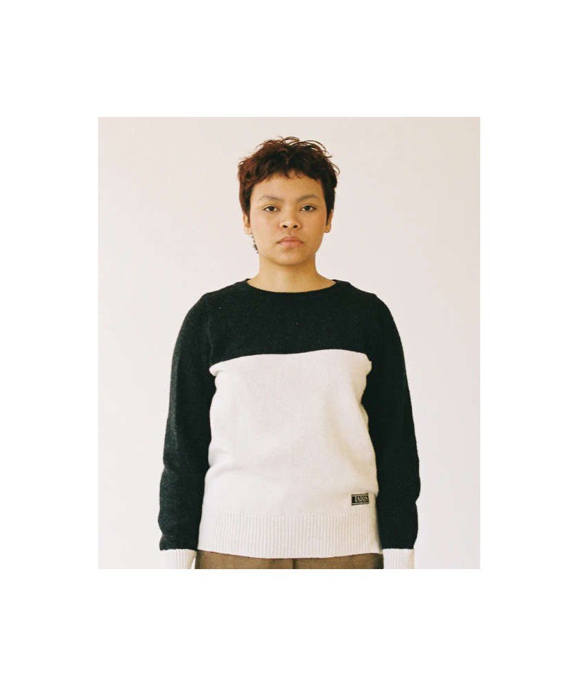 Jersei de punt blanc i negre per a dona o unisex, amb disseny bàsic i atemporal que combina amb tot. El patró recte afavoreix tota mena de cossos i es recomana portar-lo en talla folgada per més comoditat. Fet a Catalunya en petits tallers, amb 100% fil reciclat de sobrants tèxtils preconsum (20% llana reciclada i 80% acrílic reciclat). Moda sostenible creada per durar.