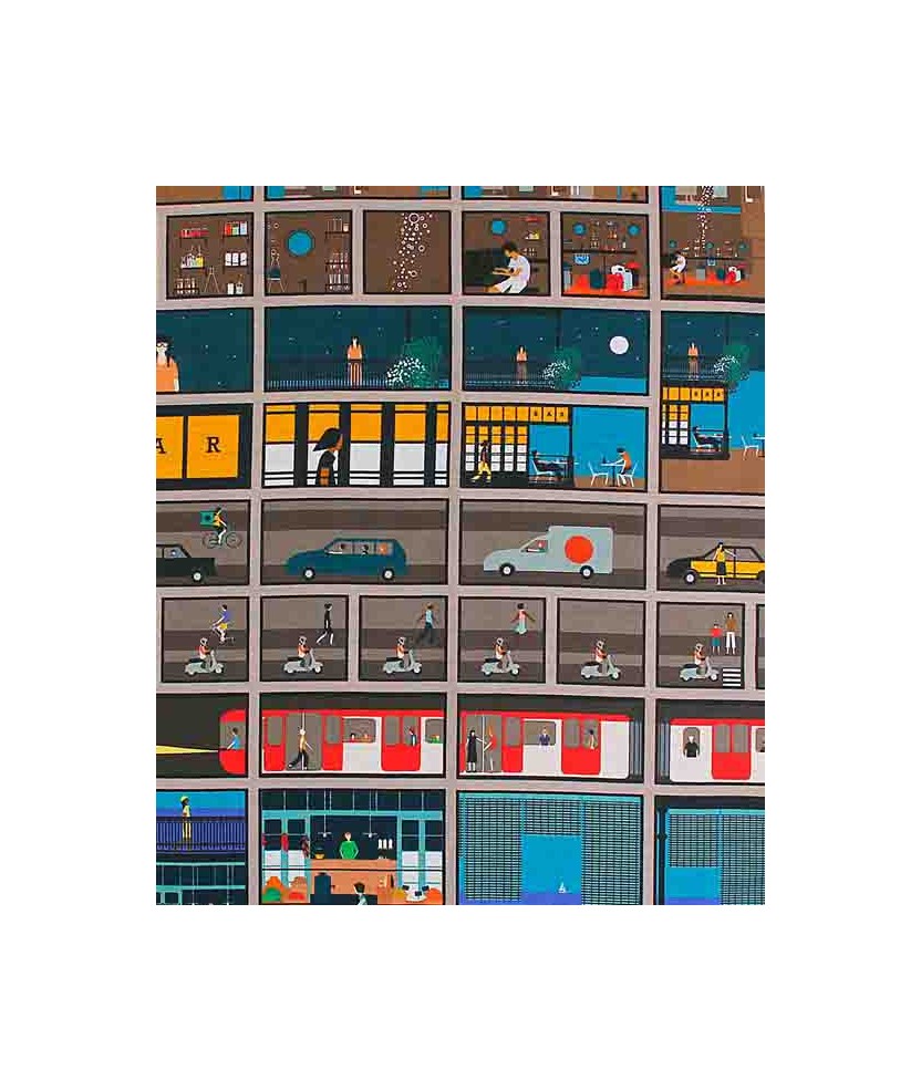 Mocador suau i molt agradable al tacte amb la pell, amb una caiguda bonica. Pertany a la col·lecció Urban Les il·lustracions descriuen una ciutat mediterrània i moderna, viva i en constant moviment. Mostren un entramat humà i arquitectònic que respira al mateix ritme. Les peces tèxtils es converteixen en relats visuals, com una novel·la gràfica o un còmic. Cada fragment convida a descobrir històries que, en observar-les, fan sentir-te part d'elles. Composició: 70% cotó 30% seda. Mides: 68x165 cm