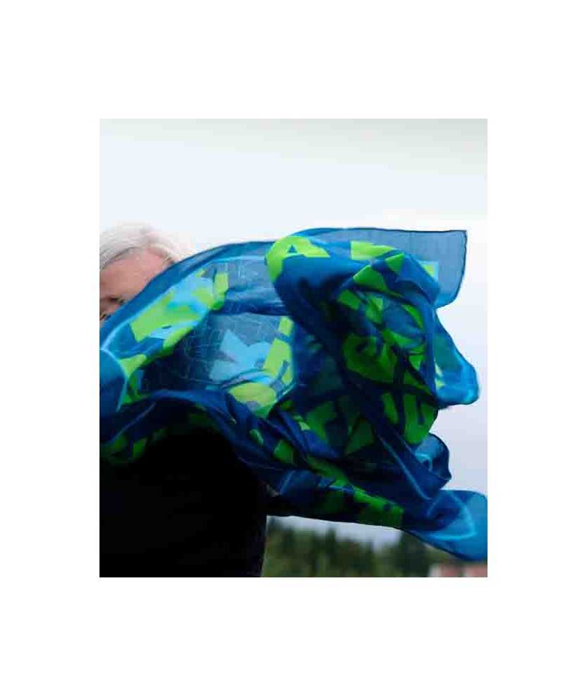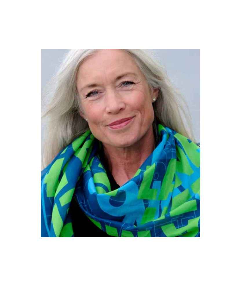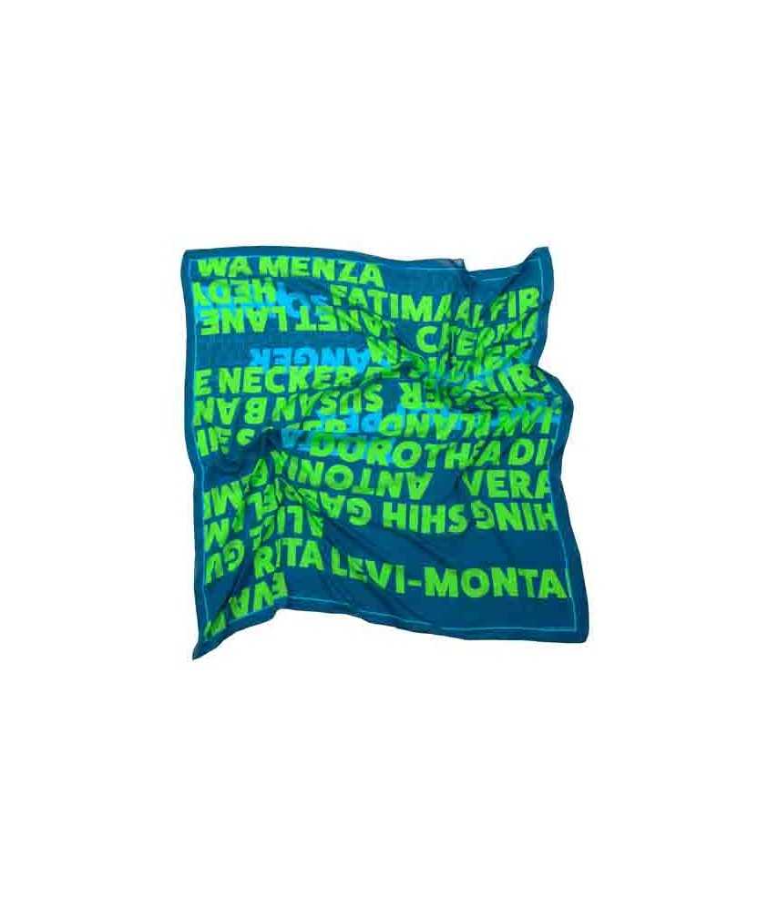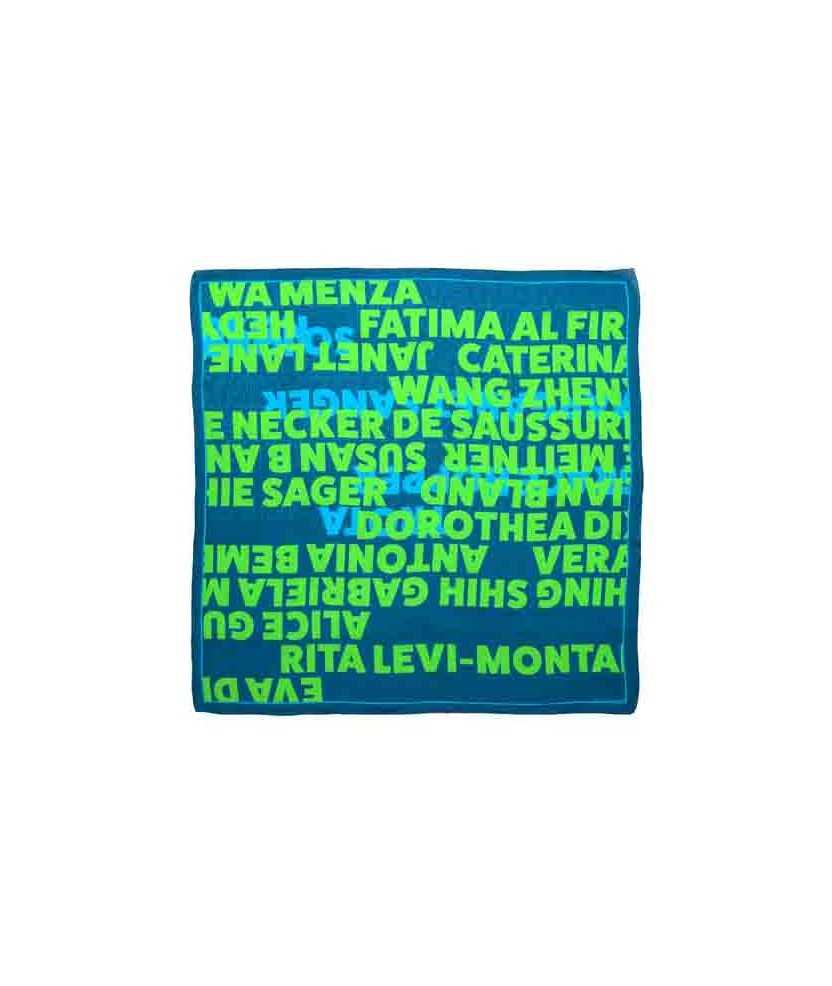 Mocador quadrat exclusiu d'edició limitada amb l'estampat 'Judy'. Amb aquest mocador portaràs amb tu un munt de dones extraordinàries, donant a altres persones l'oportunitat de descobrir-les també. Moltes de les dones representades en aquest disseny també van lluitar pel dret de les dones a determinar els seus camins. Disponible en tres combinacions de colors: Blau/verd, verd blavós/vermell flama, i morat/blanc. Doblec fet a mà. Composició: 70% cotó 30% seda. Mides: 132x132 cm.
