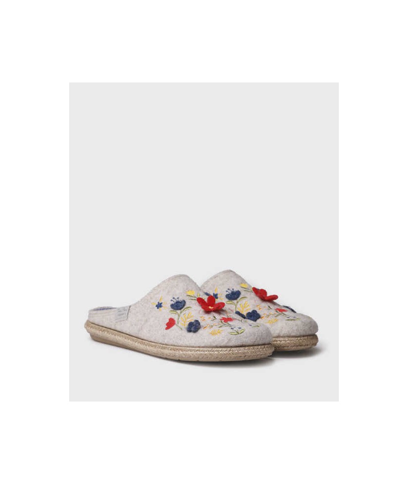 Aquesta sabatilla de casa per dona està feta de feltre de color llis amb motius brodats. La sola és plana, té 1 cm de gruix i està feta de goma antilliscant i trena de jute. Té una plantilla extraïble amb una alça de 2 cm a la part del taló.Aquest model calça la talla habitual, si estàs entre dos números tria una talla més petita. Disponible en talles 36-41.