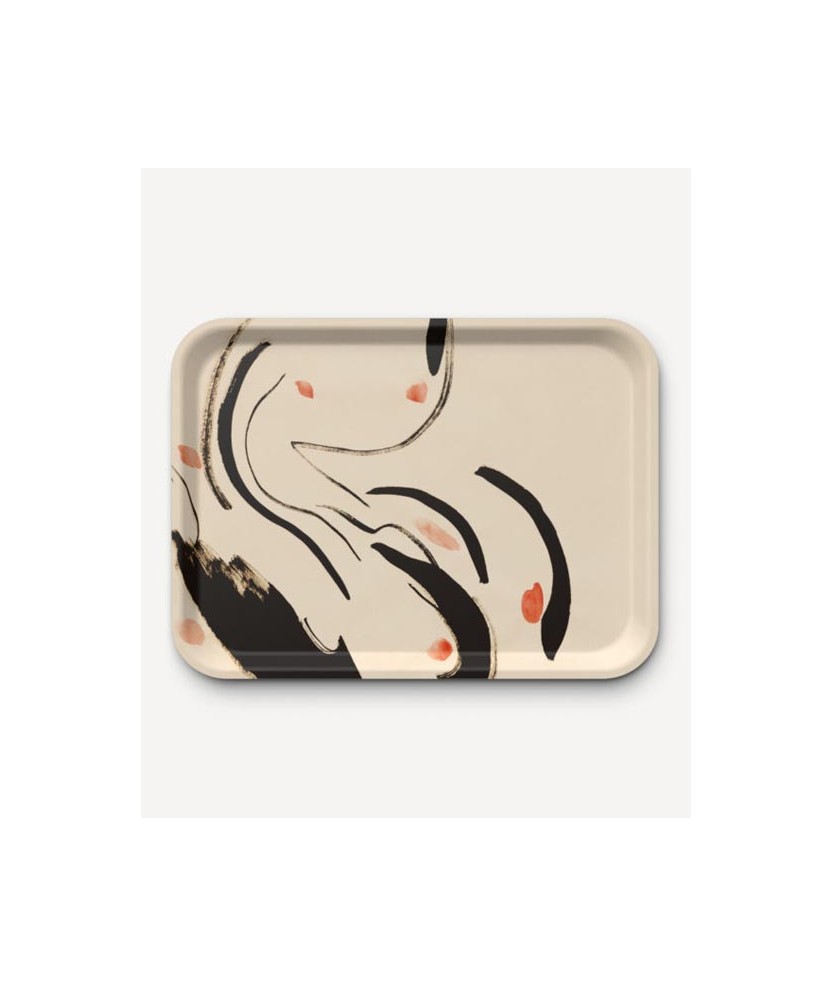 Safata premsada de la col·lecció Julia Mariscal (Barcelona, 1981) amb dibuixos originals a pinzell de l'artista. Fabricada amb una resistent base de baquelita a Bera (Navarra), presenta superfície brillant i és apilable. Apta per al contacte amb aliments i per a rentavaixelles. Elaborada amb paper kraft certificat PEFC, amb un 30% reciclat i materials procedents de fonts sostenibles. Mides: 48 x 37 cm.