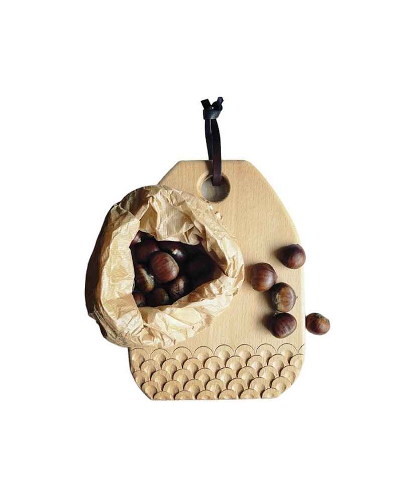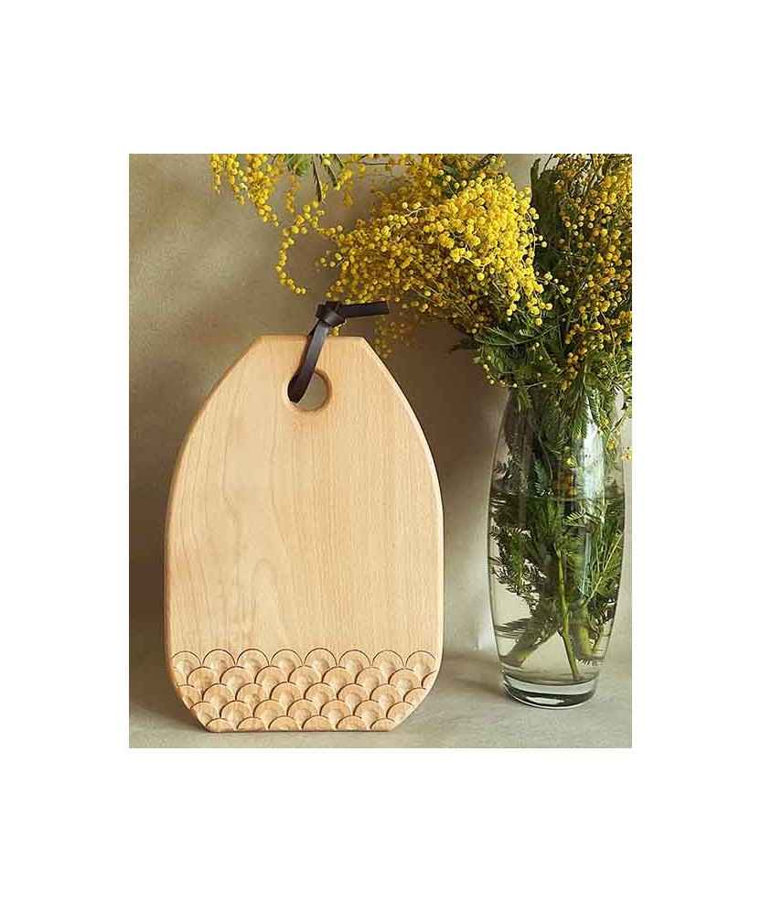 La taula Roseta està tallada a mà i més que una taula de tallar, és una taula de servir. Presenta una forma elegant i sofisticada d'exhibir ingredients, per a la vida quotidiana o per a una ocasió especial. Tallada a mà amb gúbies i mall, utilitzant tècniques tradicionals d'escultura de fusta. Inclou cordó de cuir per penjar. De fusta massissa de faig i cera d'abella 100% natural. Rentar a mà amb aigua tèbia i sabó. Assecar a l'aire. Mides: 29x20x1,5 cm.
