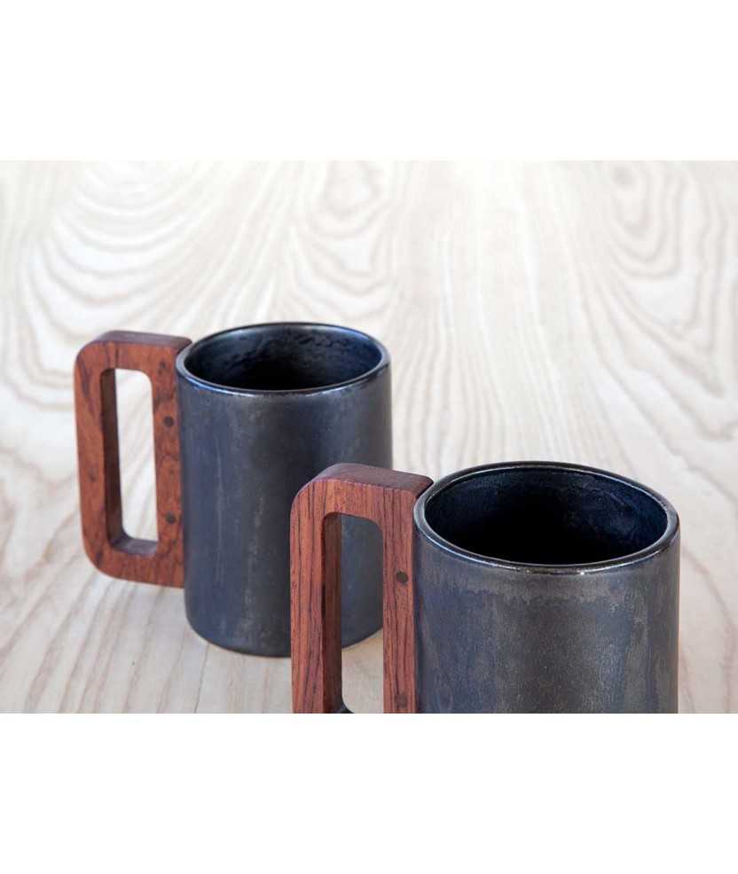 Tassa de ceràmica realitzada artesanalment en ceràmica de porcellana esmaltada a alta temperatura. La nansa és de fusta de bubinga, amb una extraordinària resistència a la humitat i als canvis de temperatura que la fan apte per a l'ús alimentari. Confeccionades íntegrament a Barcelona. Es desaconsella posar-la al microones i al rentavaixelles a temperatures superiors a 60C. Diversos models i colors disponibles. Indicar el color escollit.