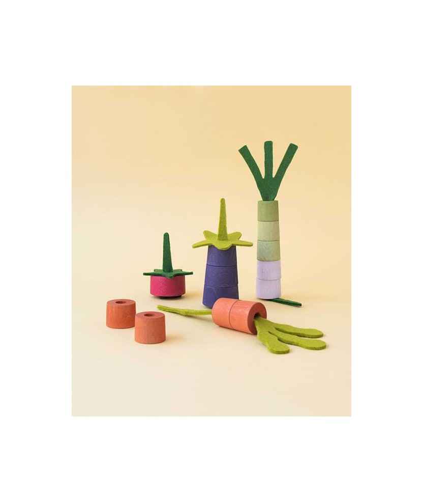 En obrir el joc trobaràs 13 peces de fusta de faig i 6 peces de feltre de llana. El joc consisteix a formar quatre verdures ordenades de menor a més dificultat. Per aconseguir-ho, primer haureu d'escollir les peces de l'hortalissa que voleu muntar, respectant l'ordre i el color. Fet a Barcelona. Edat: +2 anys.