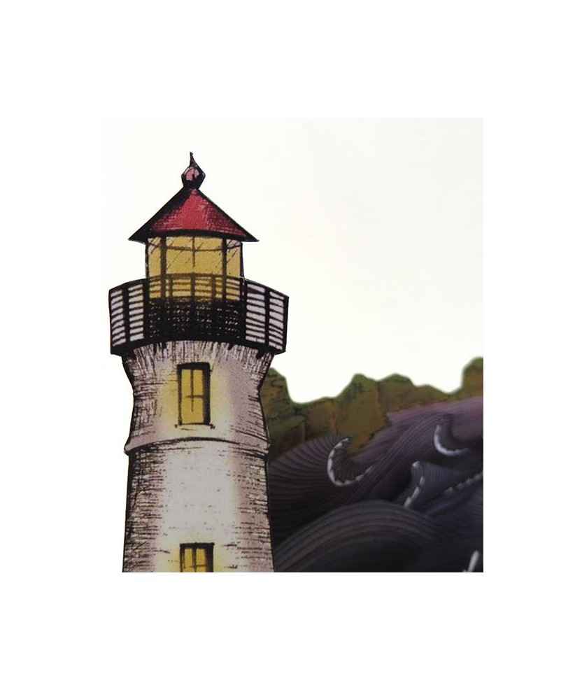 Llibre d'artista en format acordió inspirat en la costa atlàntica. Mostra un far il·luminat en primer pla i un mar amb penya-segats al fons. Impressió digital a color, retallat i muntat a mà. L'acordió permet diverses posicions d'obertura. Mides: 20,5x13,5 cm.
