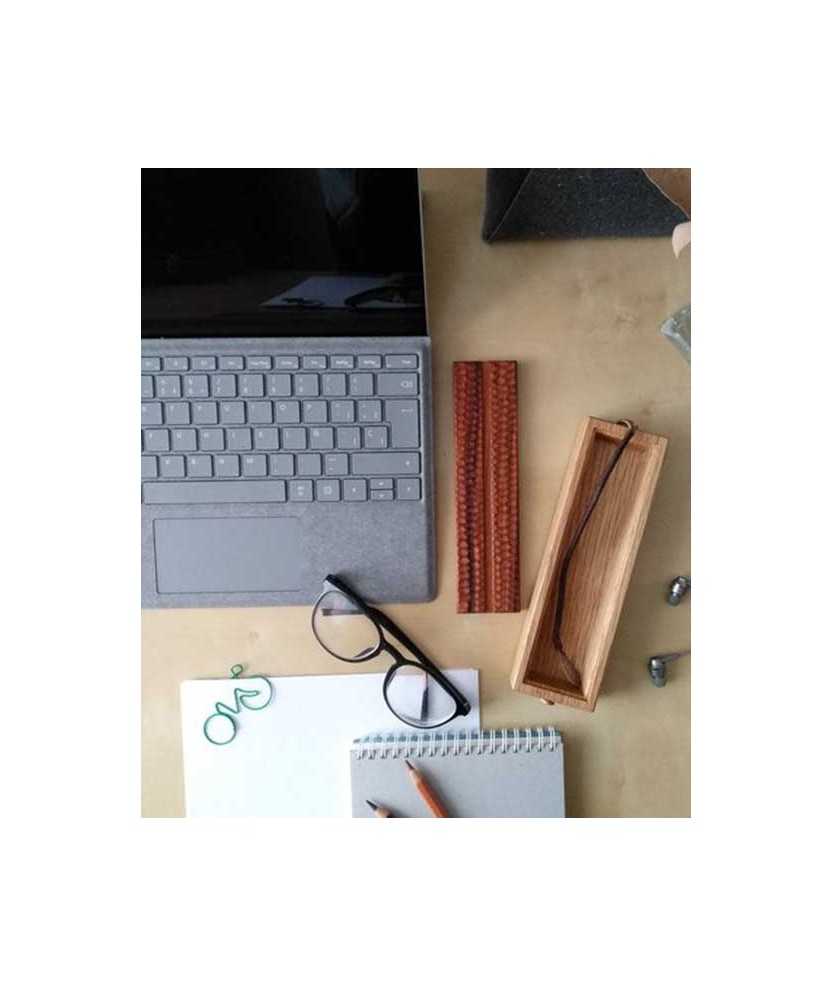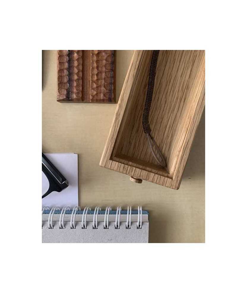 Estoig per a llapis o altres estris d'escriptura, fabricat a partir d'una peça de roure massís i rematat amb una tapa tallada a mà, de fusta de pau ferro, que es manté tancada gràcies a un cordó elàstic envoltat de fil encerat que va enganxat a un extrem de la caixa per evitar que es perdi quan l'estoig és obert. Mides: 20,5x6x4,5 cm.