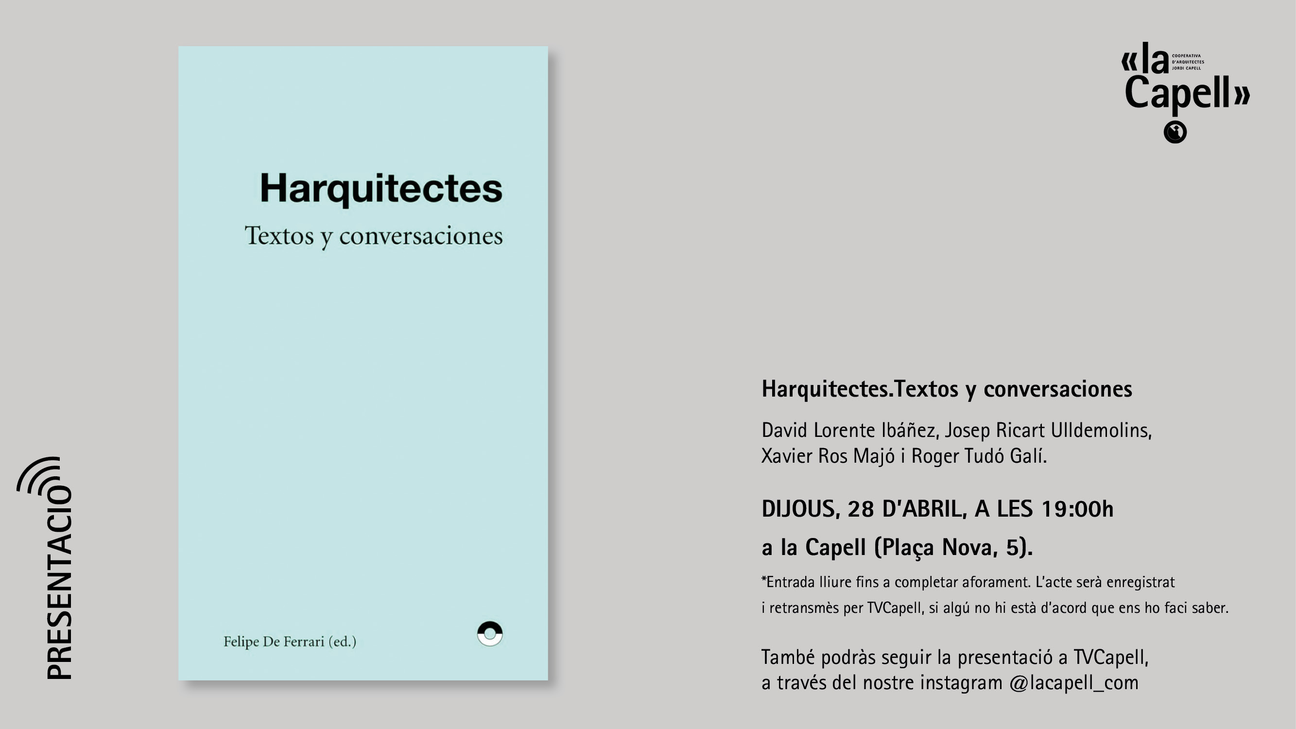 El proper 28 d'abril a les 19:00 h a la Capell tindrà lloc la presentació del llibre "Harquitectes.Textos y conversaciones⁣⁣"⁣, amb la participació de JDavid Lorente Ibáñez, Josep Ricart Ulldemolins, Xavier Ros Majó i Roger Tudó Galí.. ⁣⁣⁣⁣⁣⁣⁣⁣⁣⁣⁣
