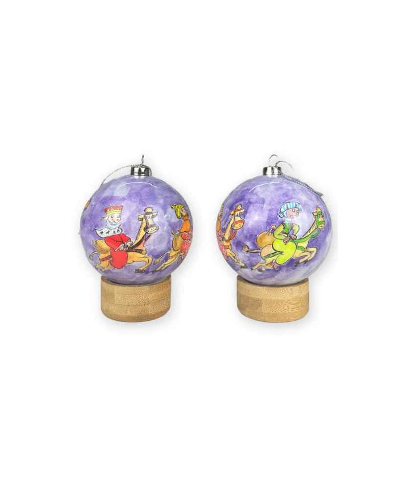 Aquesta bola de Nadal de 8 cm de diàmetre mostra, amb l'estil dolç de la Pilarín Bayés, el viatge màgic dels Tres Reis d'Orient cavalcant sota un cel blau violeta guiat per l'estrella. Una peça plena d'imaginació i calidesa, perfecta per donar vida al teu arbre i recordar la il·lusió d'aquesta nit tan especial. El packaging inclou una peana de cartró amb la il·lustració original de l'autora. Mesures: 8 cm de diàmetre · Materials: Peana de cartró.