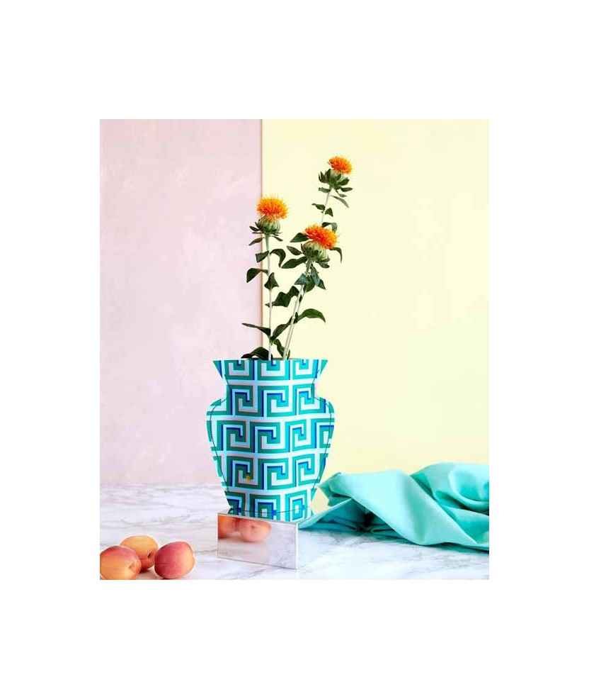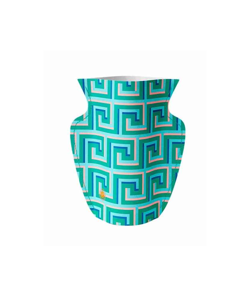 Gerro decoratiu elaborat amb paper impermeable de 180 g, amb estampació metàl·lica i cosit a mà. Inspirat en el Mediterrani, és perfecte per decorar taules o escriptoris, o per fer un regal original i delicat. Inclou targeta i sobre. Dimensions: 16,8 x 16,8 cm.