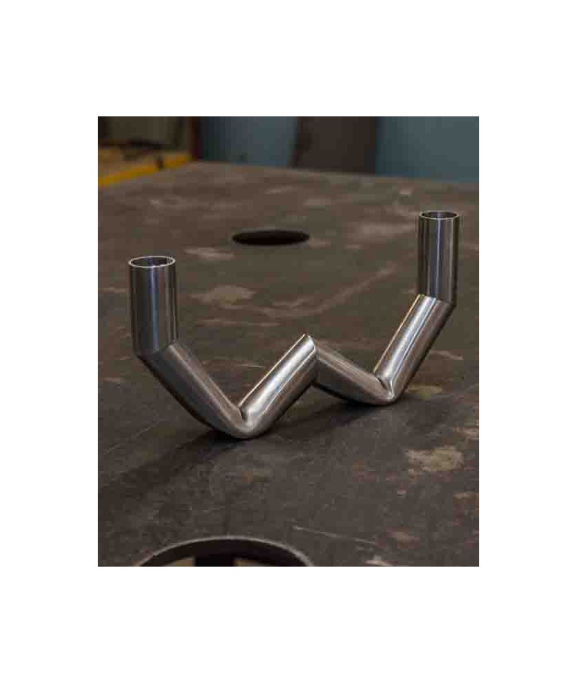 Els rituals són a la vida el que les coses són a l'espai, les coses tenen 'la tasca d'estabilitzar la vida humana'. Aquesta peça és una exploració al voltant del tub. Després d'una sèrie de proves de flexió, em vaig adonar de la bellesa dels plecs i les seves propietats estructurals. Un cordó de soldadura aconsegueix un equilibri gairebé simètric en aquest canelobre per a dues espelmes que es troben una davant de l'altra. Mides: 23x12x2.5cm