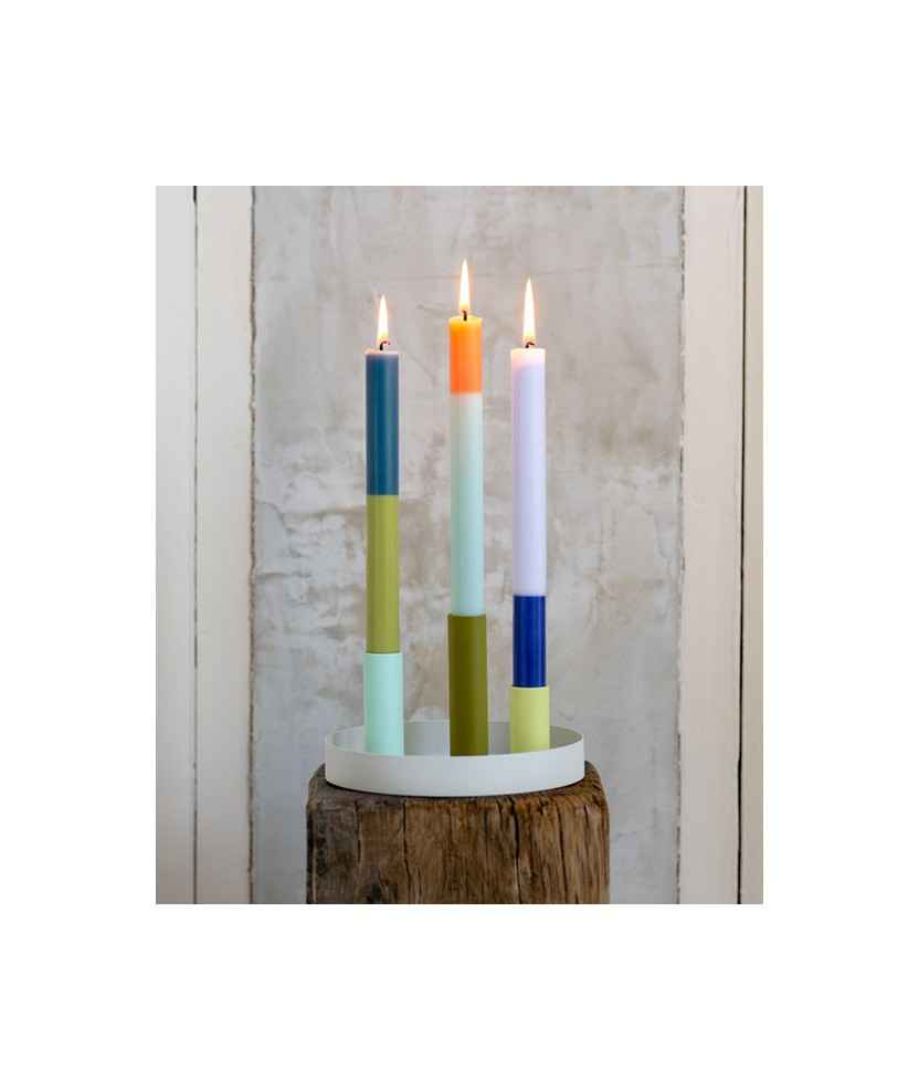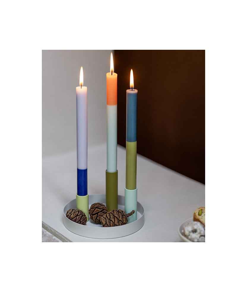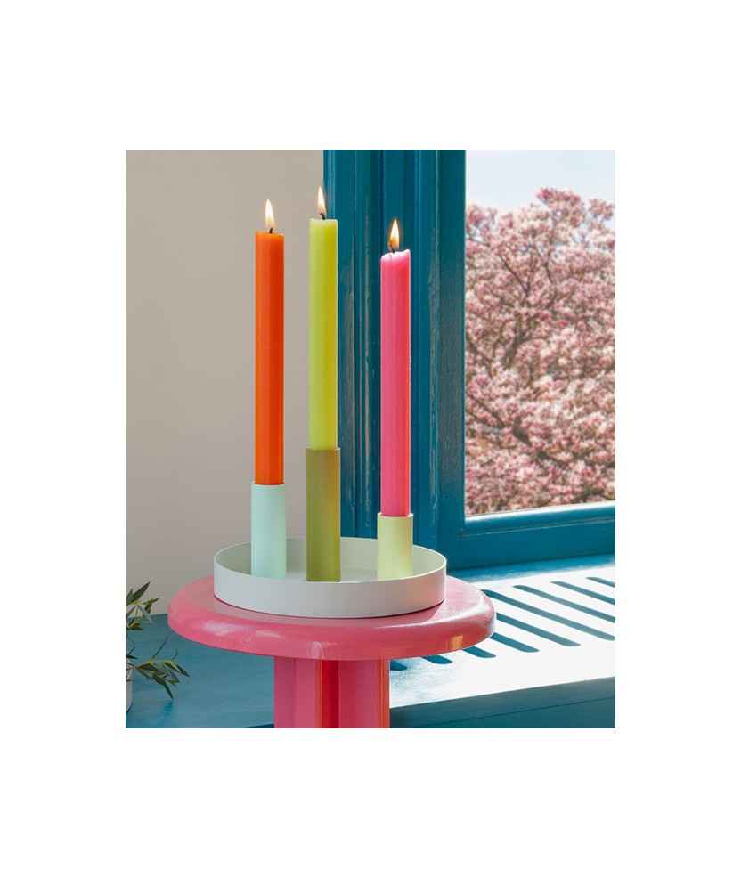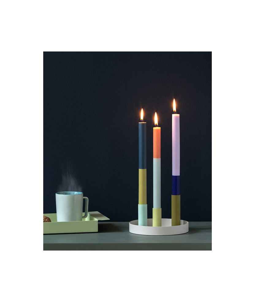El portaespelmes Luna està format per una petita safata que incorpora tres canelobres de colors. Gràcies als imants integrats, es poden col·locar lliurement en la posició que es vulgui. La seva base és antilliscant i antibolcada. Mides safata: 17 cm, canelobres: 10, 8 i 6 cm.