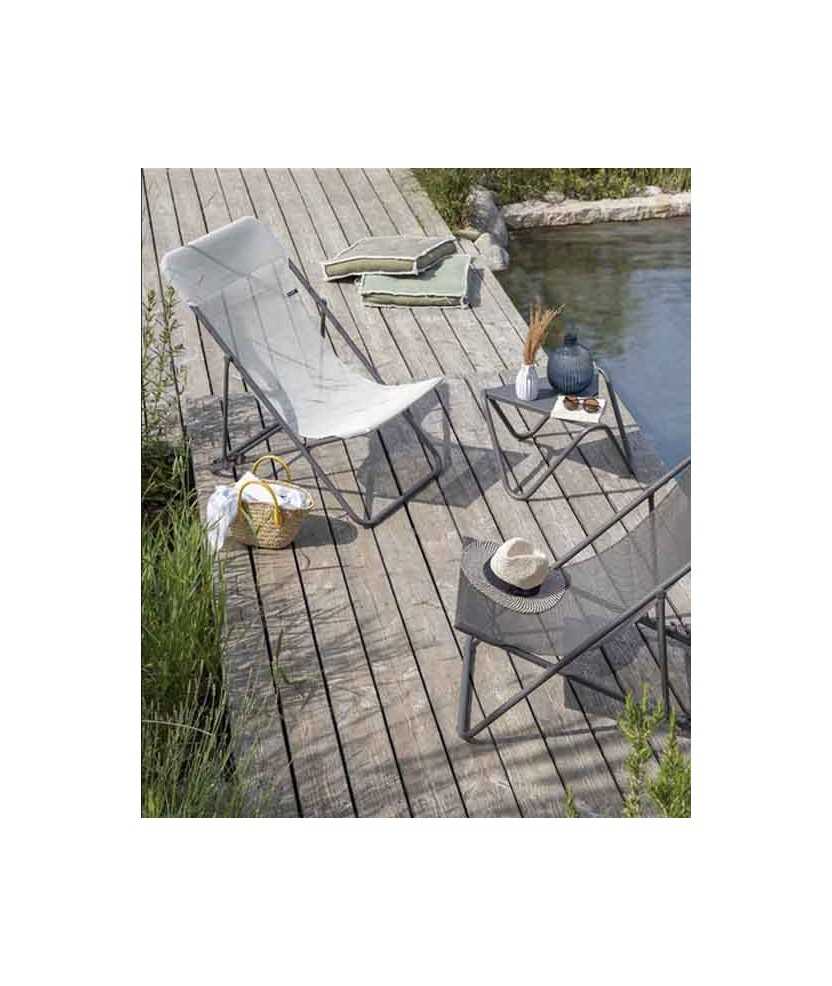 La gandula Maxi Transat compta amb unes dimensions generoses, perfectament adaptades a les noves exigències de confort. Robusta, ultracompacta i fàcil de netejar, encaixa a la perfecció tant a la terrassa, al jardí o al costat de la piscina com a l'interior de la casa. El plegat ultracompacte la fa fàcil de transportar i de guardar. Fabricada amb tela Batyliner Iso, que és resistent als raigs UV i no reté l'aigua. Es pot ajustar fins a 4 posicions. Pes: fins a 140 kg. Mides tancada: 124x62x6 cm. Mides oberta: 83x62x96 cm.