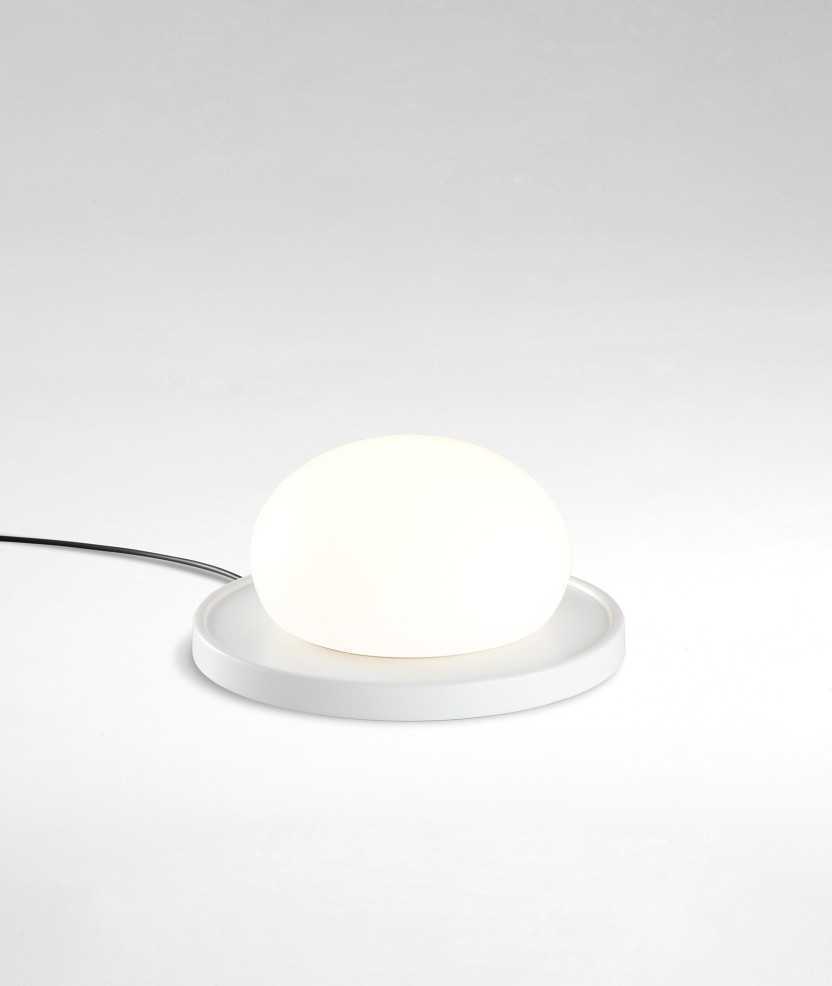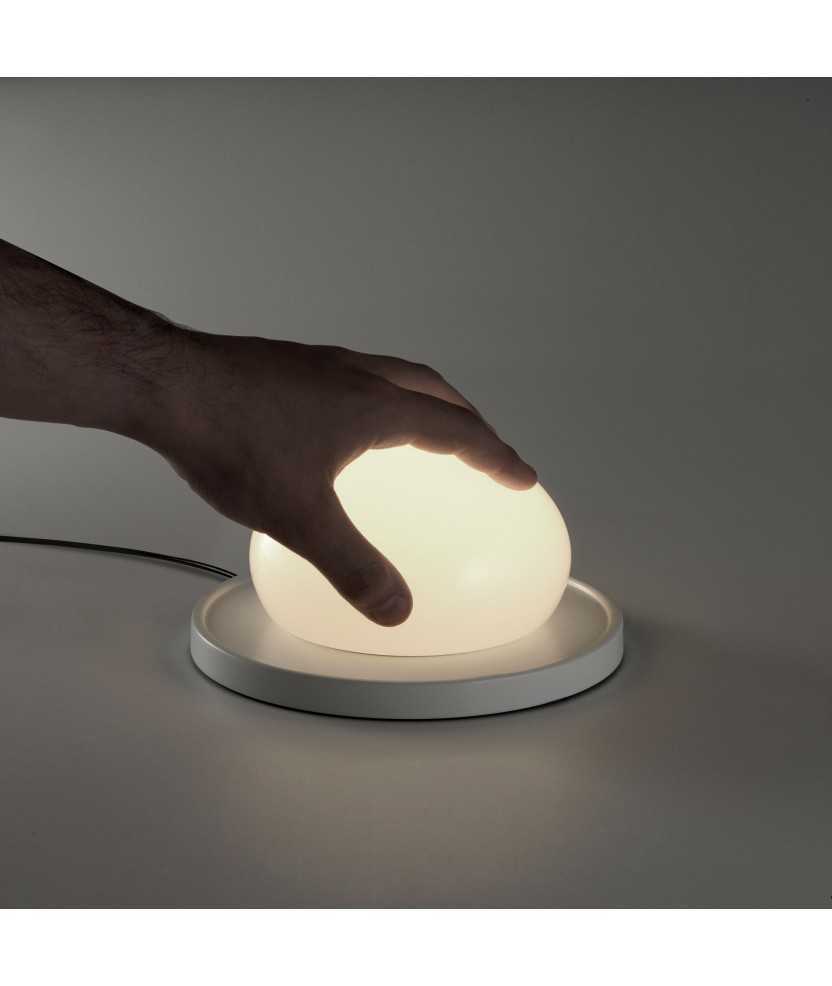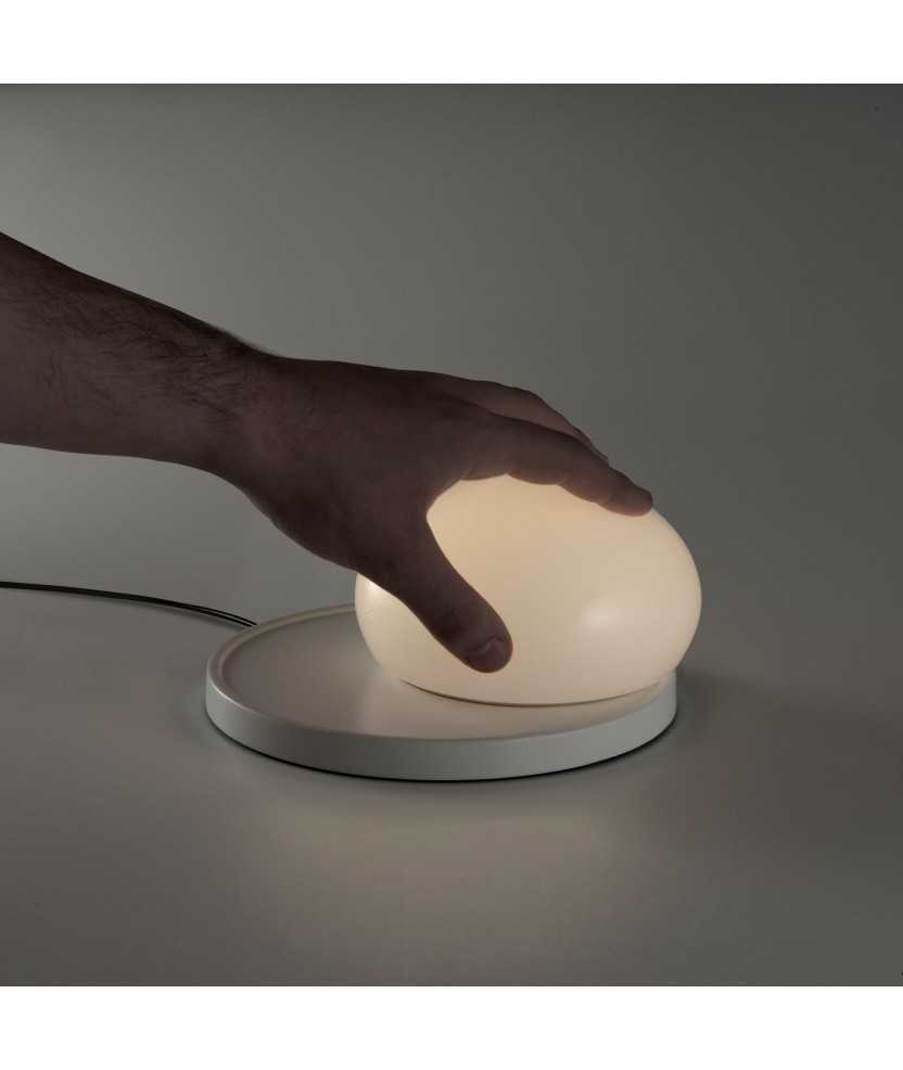 Llum de sobretaula que convida a tocar-la per a modular-la. Una superfície rodona amb un LED al seu centre, complementada per una bola de vidre superposada que, en desplaçar-se, atenua o augmenta la llum produïda. L'estudi kaschkasch reivindica així el sentit del tacte i la forma mecànica en uns temps digitals i electrònics. Base disponible en colors blanc i gris. Mides: 18x9 cm.