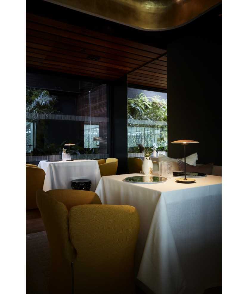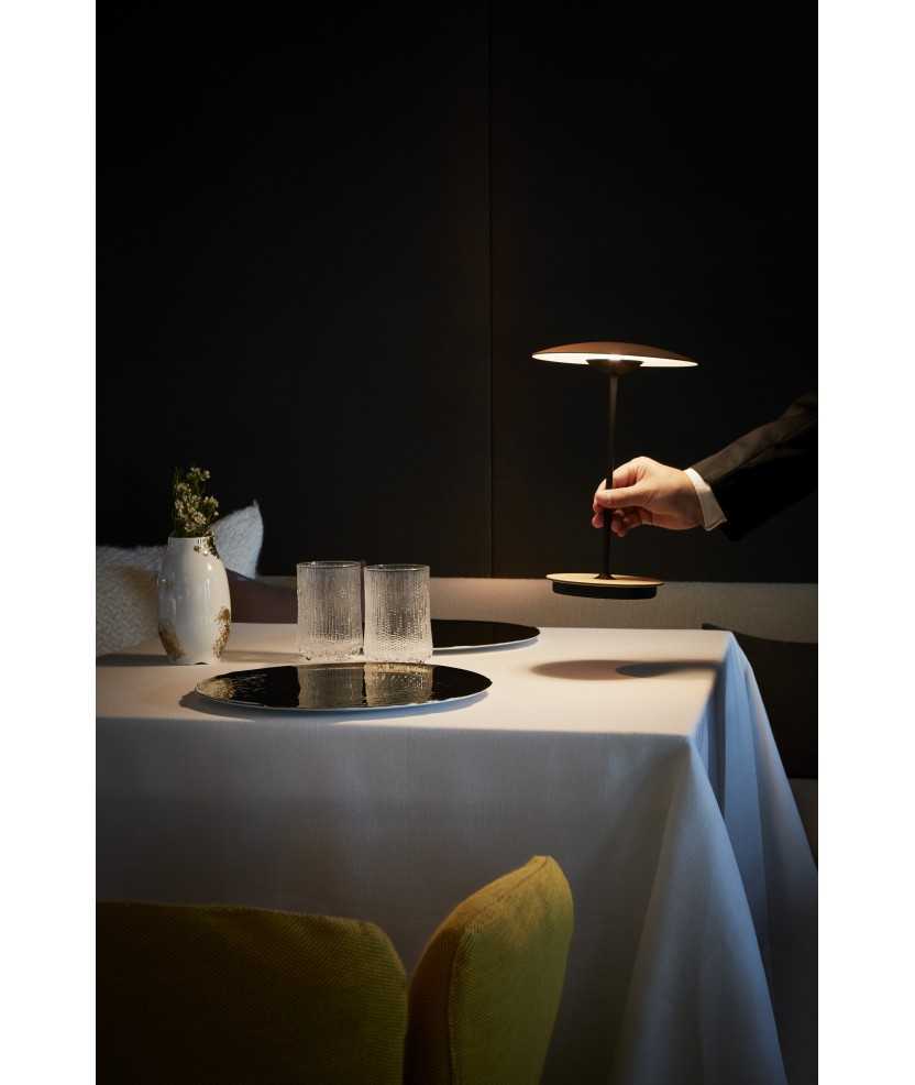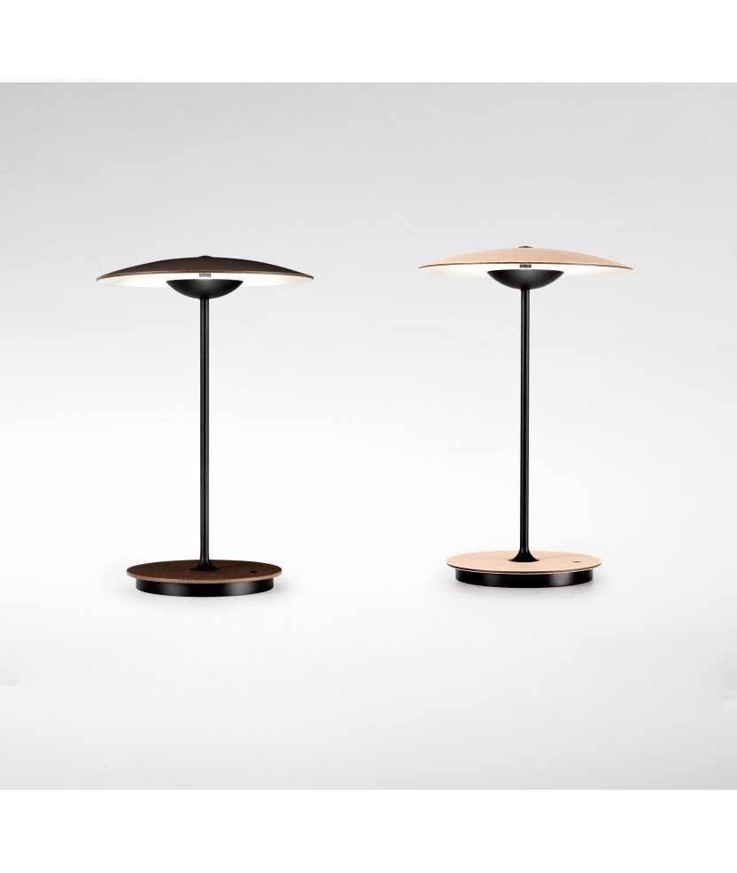 Última incorporació a la col·lecció Ginger, model de sobretaula portàtil, recarregable i sense cables, que permet il·luminar amb total llibertat un espai de forma autònoma. La combinació de làmines de fusta, de roure o wengué, paper i resines premsats a alta pressió, aconsegueix una llum d'aspecte quasi pla, sobri, que ofereix una il·luminació indirecta des d'una presència discreta. Mides: 30x19.5 cm. Disponible en fusta de roure o wengué.