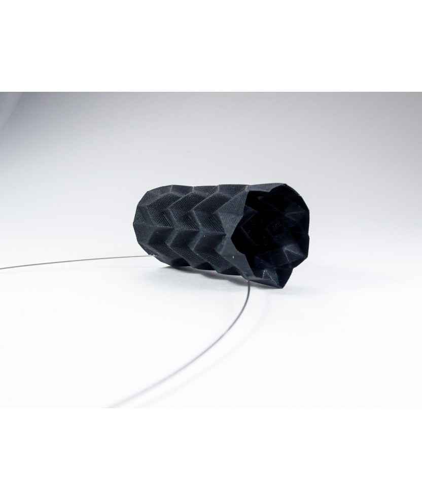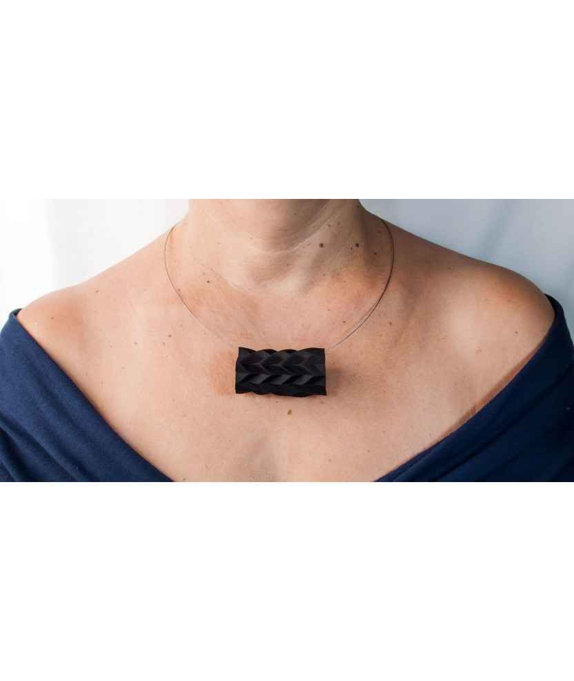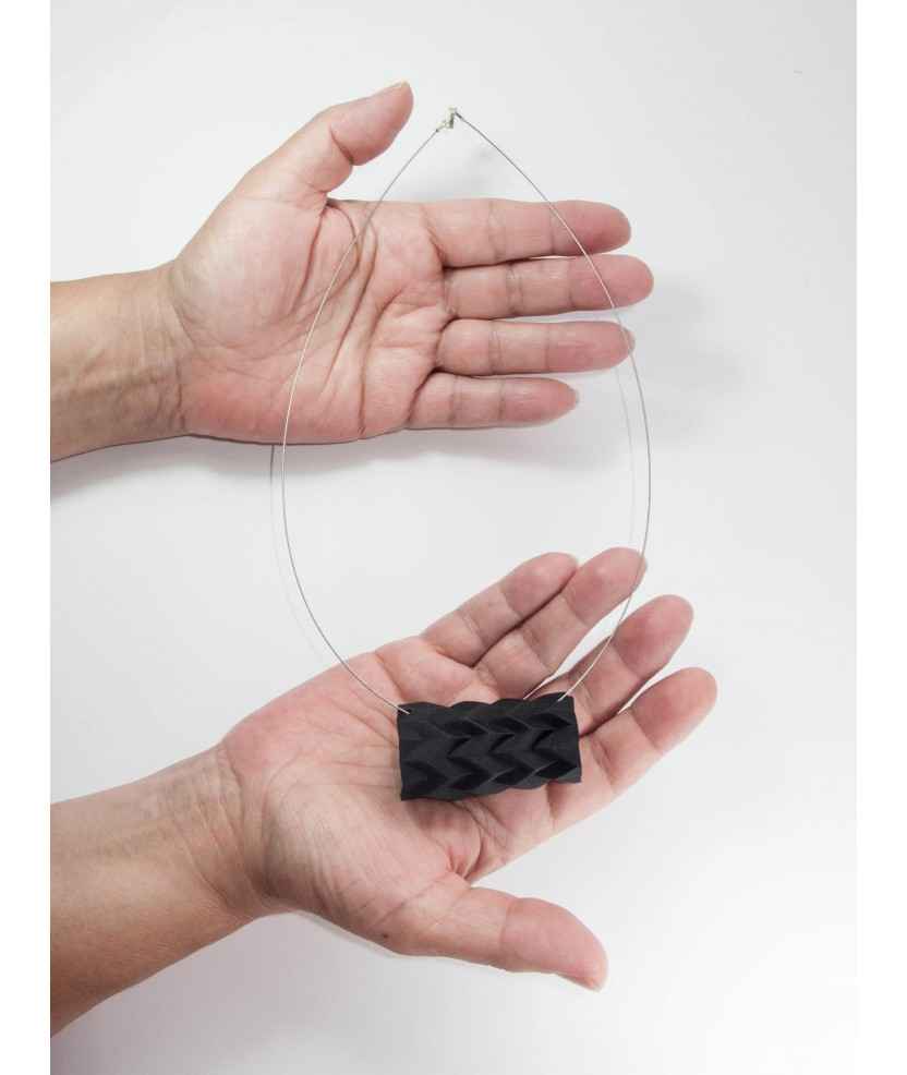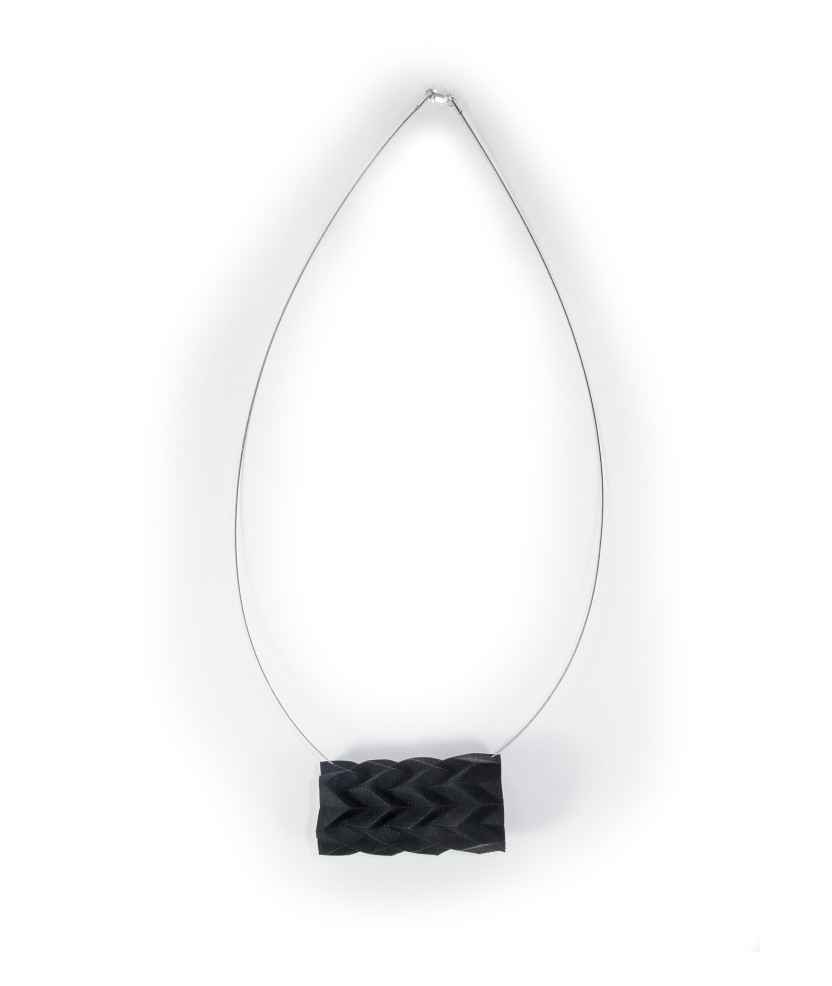 Col·lecció de collarets formats per unes peces escultòriques que resulten unes joies elegants, vistoses i diferents. Fil d'acer de 50 cm de llarg, tancament de plata i tela tubular amb un tub de plata interior. Disponible en diversos colors. Elisava alumni.