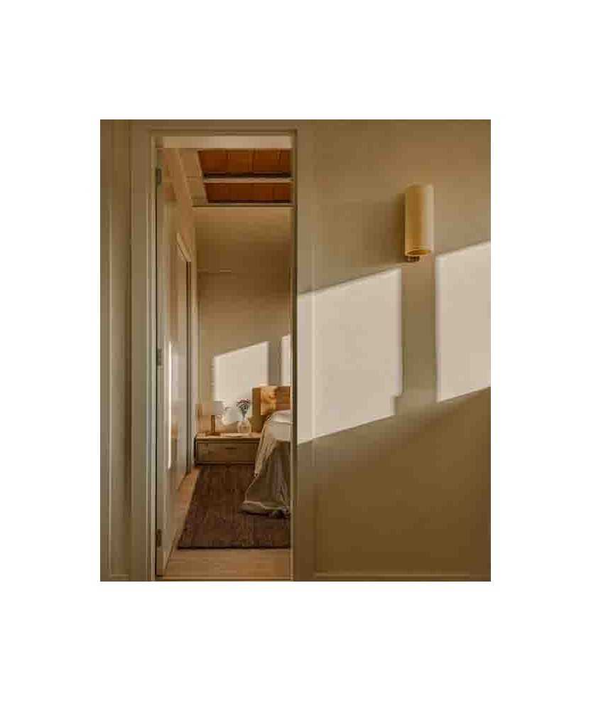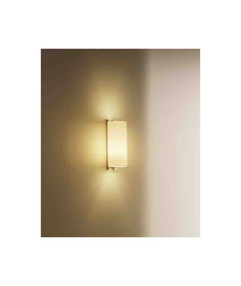 Els aplics de la sèrie TMM consisteixen en una senzilla canaleta de fusta on se circumscriu parcialment la pantalla de cartolina. Aplic llarg amb el cable exterior, que actua com a tirador de l'interruptor. Disponibles en color beige o blanc. Mides: 34 x 15cm.