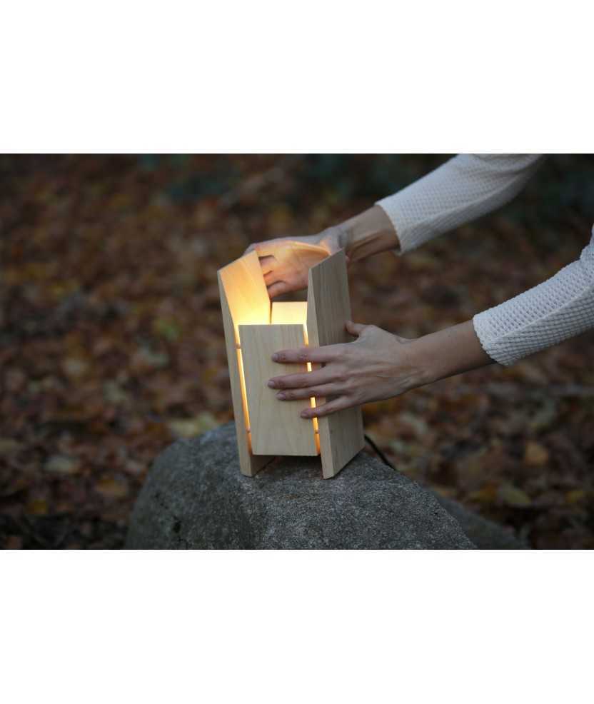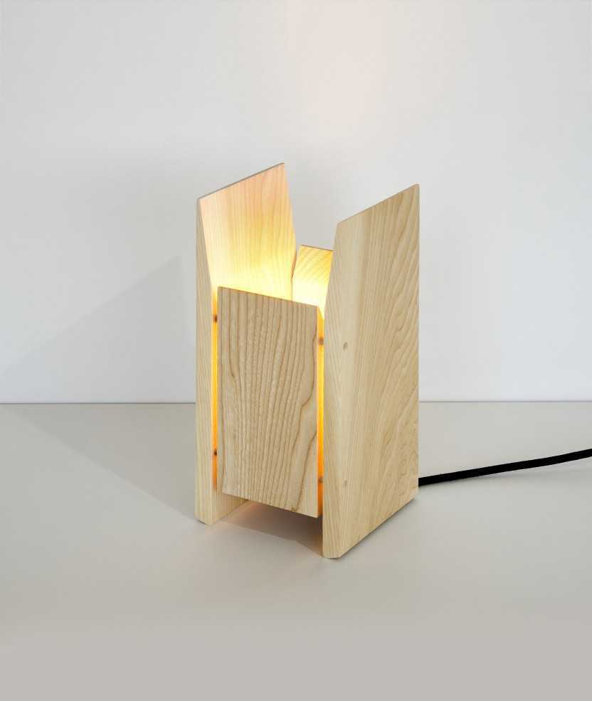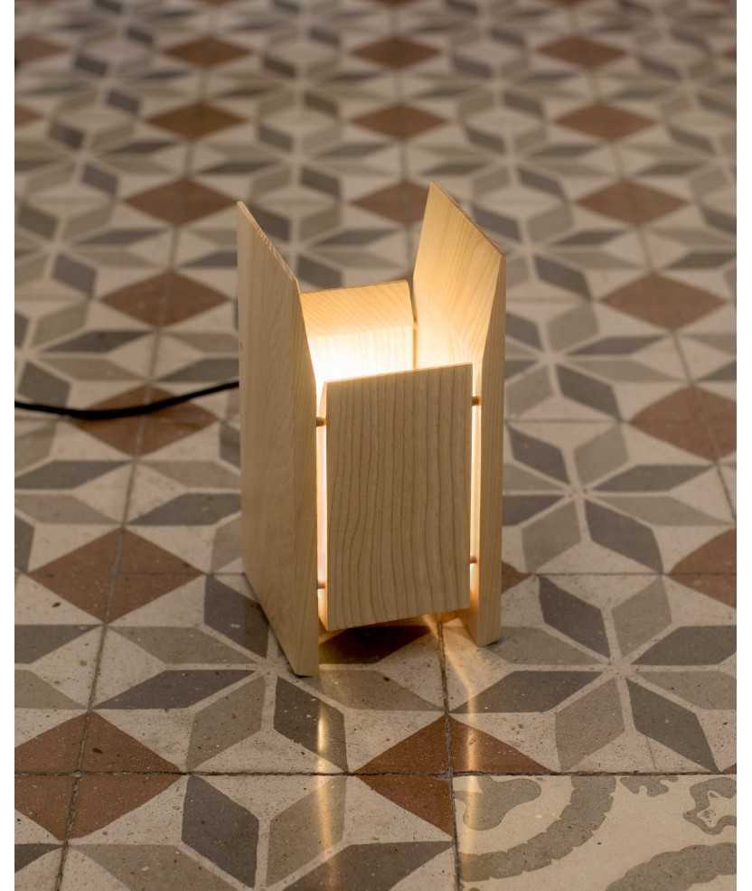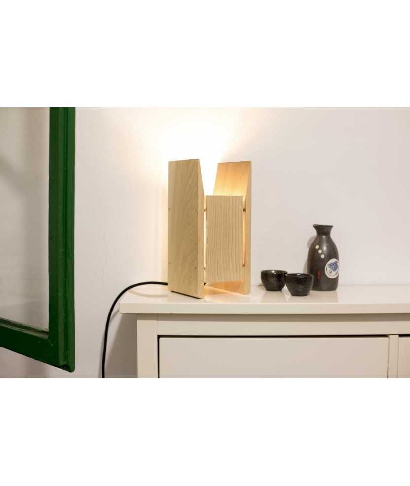 Llum de sobretaula en fusta massissa de freixe. Col·lecció de llums per a interior, inspirada en la lleugeresa del vol de les papallones. Fabricada localment per Nuuat, de forma artesanal en taller d'ebenisteria. Mides: 12x12,8x27cm. En tractar-se de fusta natural, la tonalitat i les vetes poden variar lleugerament.