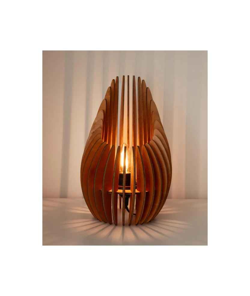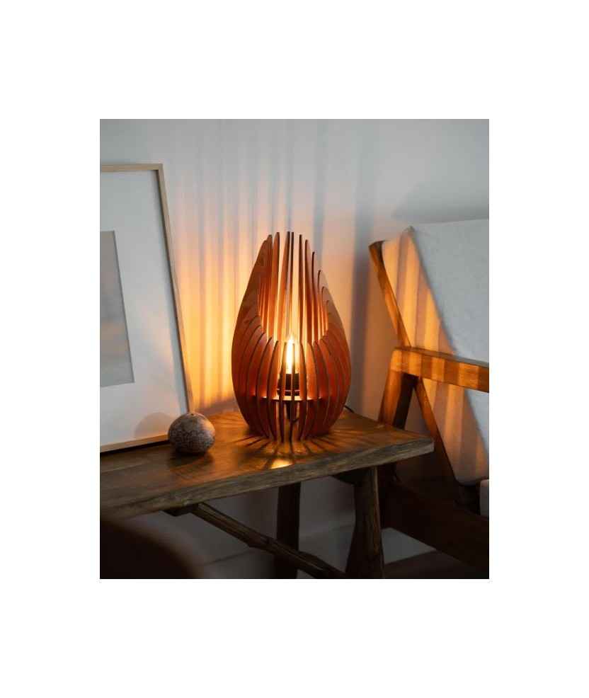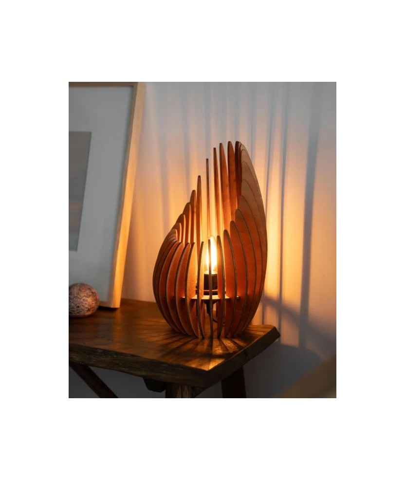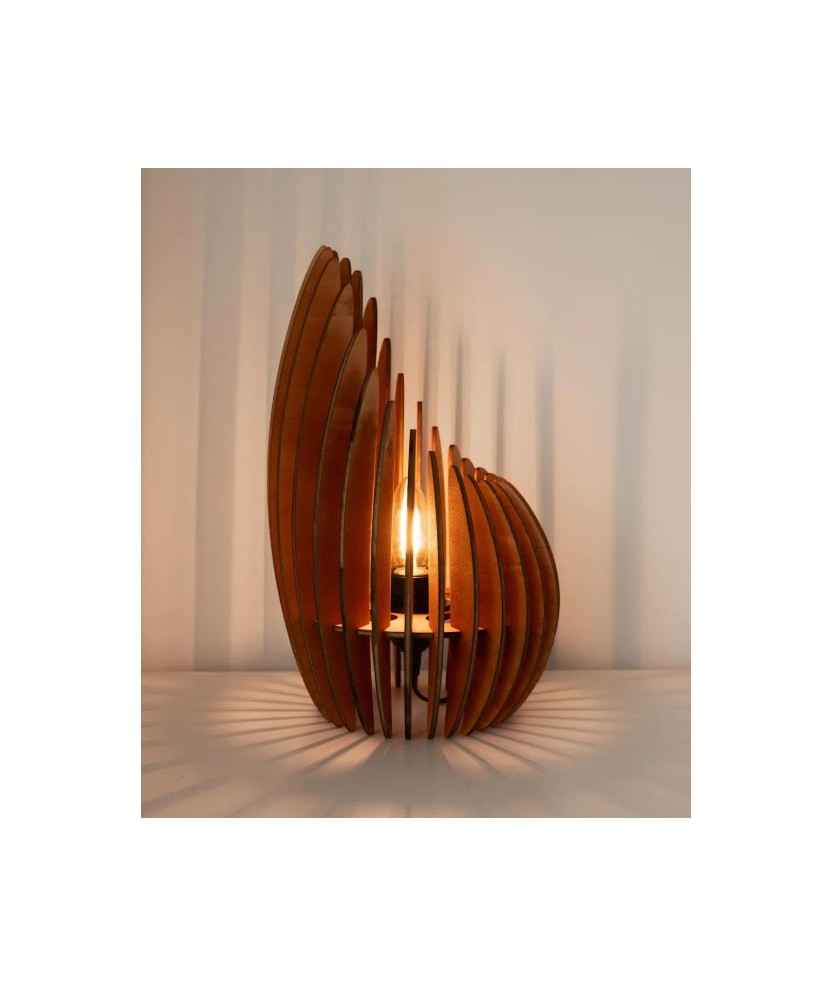 El llum de sobretaula Nazare, dissenyat per Pippo Creations, combina disseny paramètric i sostenibilitat. Fabricada amb fusta contraxapada de 4mm i pensada per ser acoblada fàcilment per l'usuari, aporta calidesa i estil a qualsevol espai. Inclou portalàmpades E27 amb cable i interruptor, però no la bombeta. Cada peça és única, feta amb processos digitals com el tall làser i materials naturals. Mides: 21,5x34,5 cm.