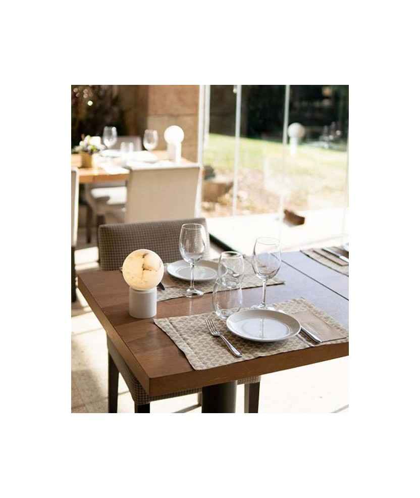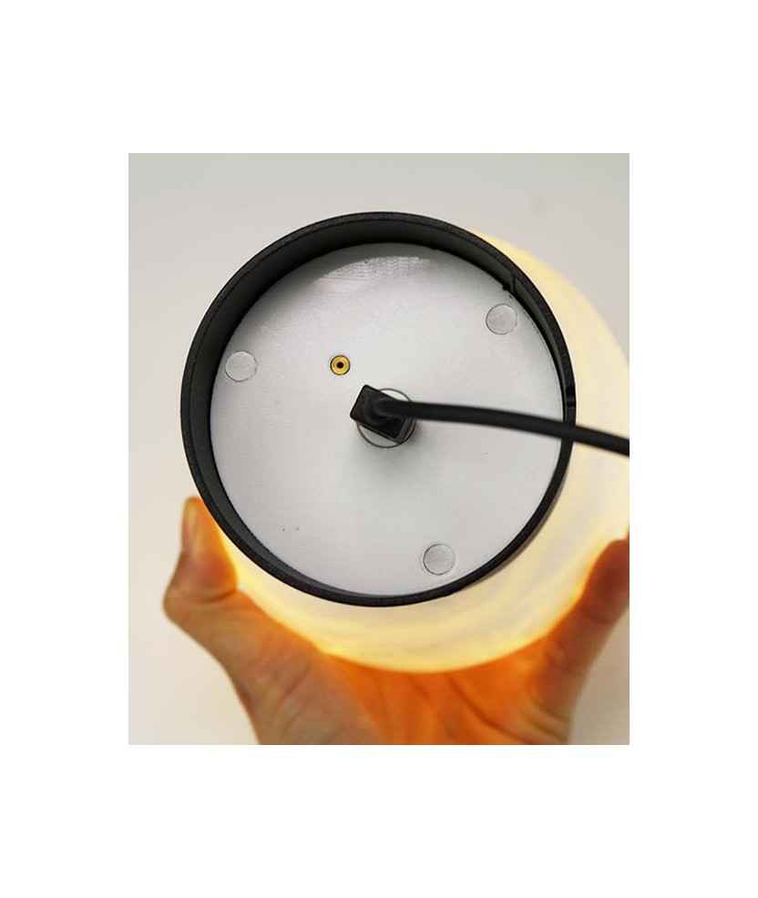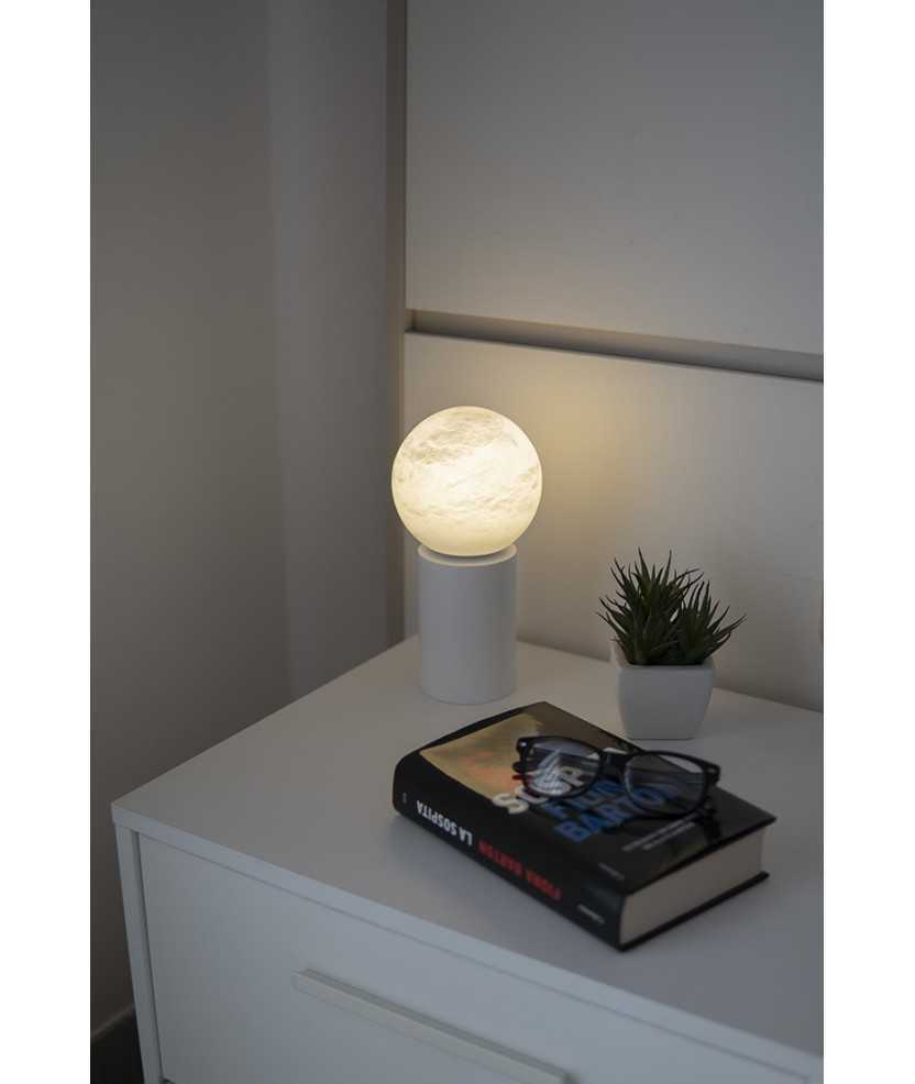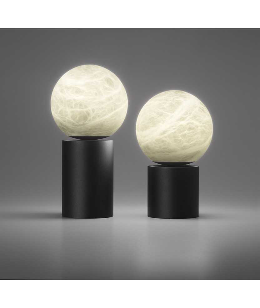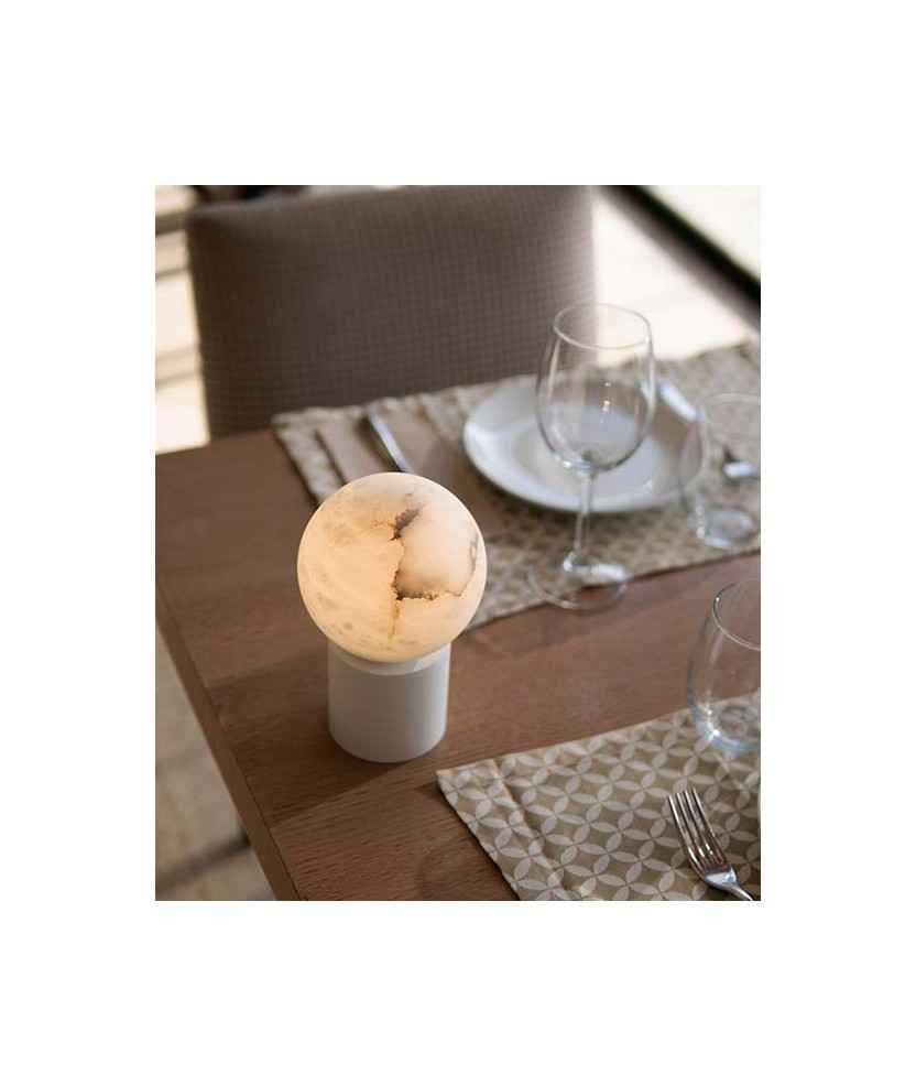 La seva pantalla esfèrica d'alabastre, transmet una gran calidesa quan està encesa i d'un aspecte molt bonic quan està apagada. Aquesta pedra, provinent de pedreres nacionals, confereix a cada pantalla una identitat única, amb vetes blanques i grises, de vegades amb algun matís de color terrós fascinant i una suau translucidesa. Disponible en dues altures, 20 i 24 cm i base d'acer galvanitzat en color negre o blanc. Bateria recarregable per USB amb autonomia de fins a 8h. Mides: 20x12x12 cm. Finalista Premi Delta ADI-FAD 2020.