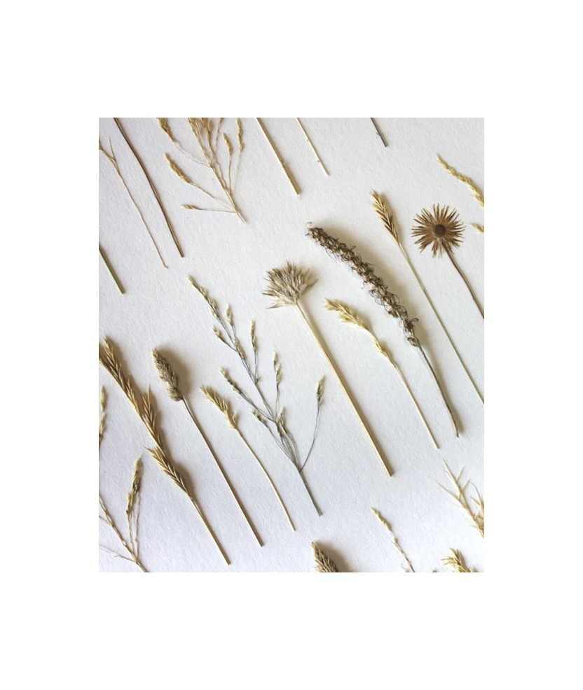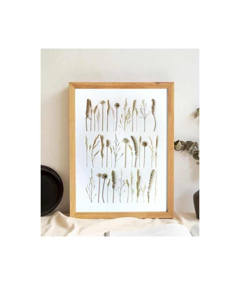 Herbari de flors naturals premsades i preservades, sobre cartolina blanca de 300gr. Per a una conservació òptima, l'herbari ha d'estar sempre emmarcat, evitar la incidència directa del sol i els llocs humits. Fet per Carabassa Crafts, una marca de decoració inspirada en les formes orgàniques que es troben a la natura. Flors: herba nuosa, albellatge, dàctil, fenàs, trèvol pudent, mata ullastre i llantén. Mides: 30x40 cm.