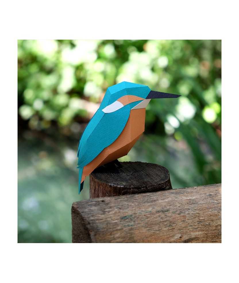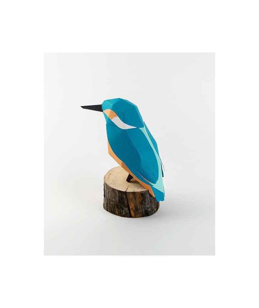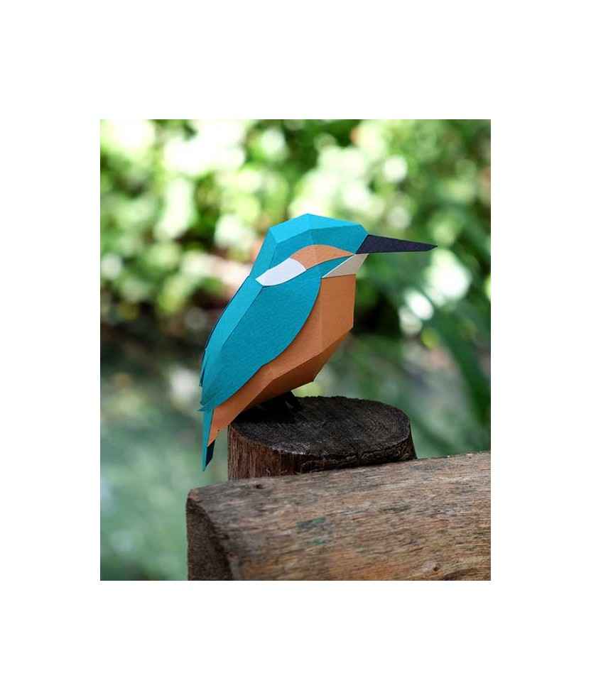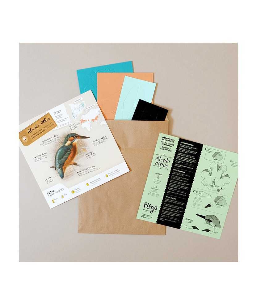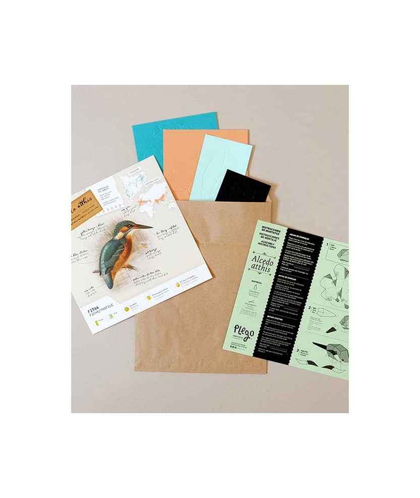 Kit per a construir un ocell de paper, que inclou papers d'art de polpa tenyida, amb un 50% de cotó i resistents a la llum, una fitxa didàctica amb les principals característiques de cada espècie, i les instruccions de muntatge. Les peces venen pretallades i marcades per facilitar el plegat i el muntatge. Tots aquests materials es presenten en una carpeta resistent i atractiva. Es necesita cola blanca de manualitats. El blauet és una figura de fàcil muntatge, pensada perquè es pugui col·locar amb la cua penjant.