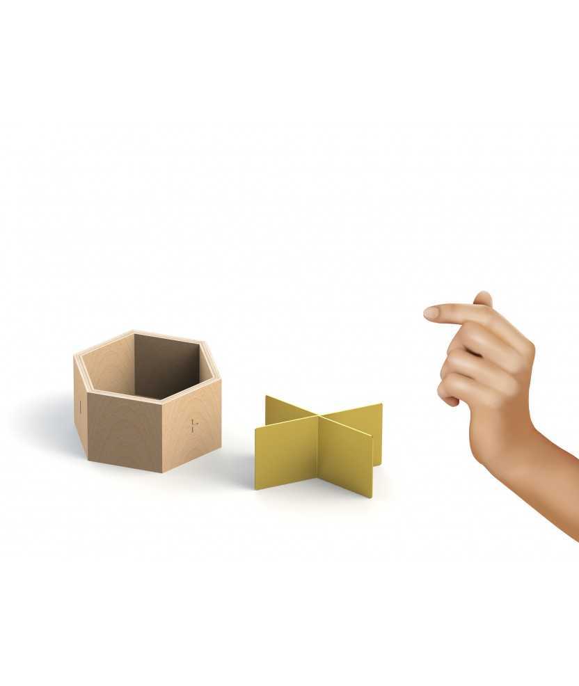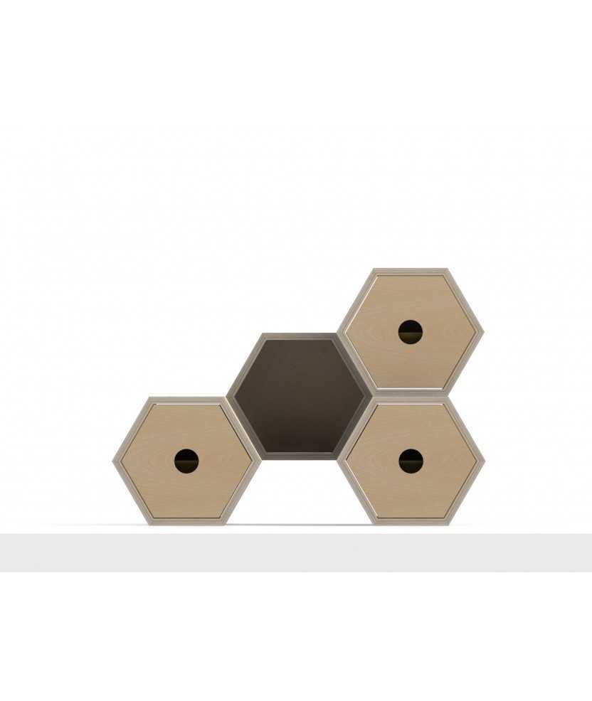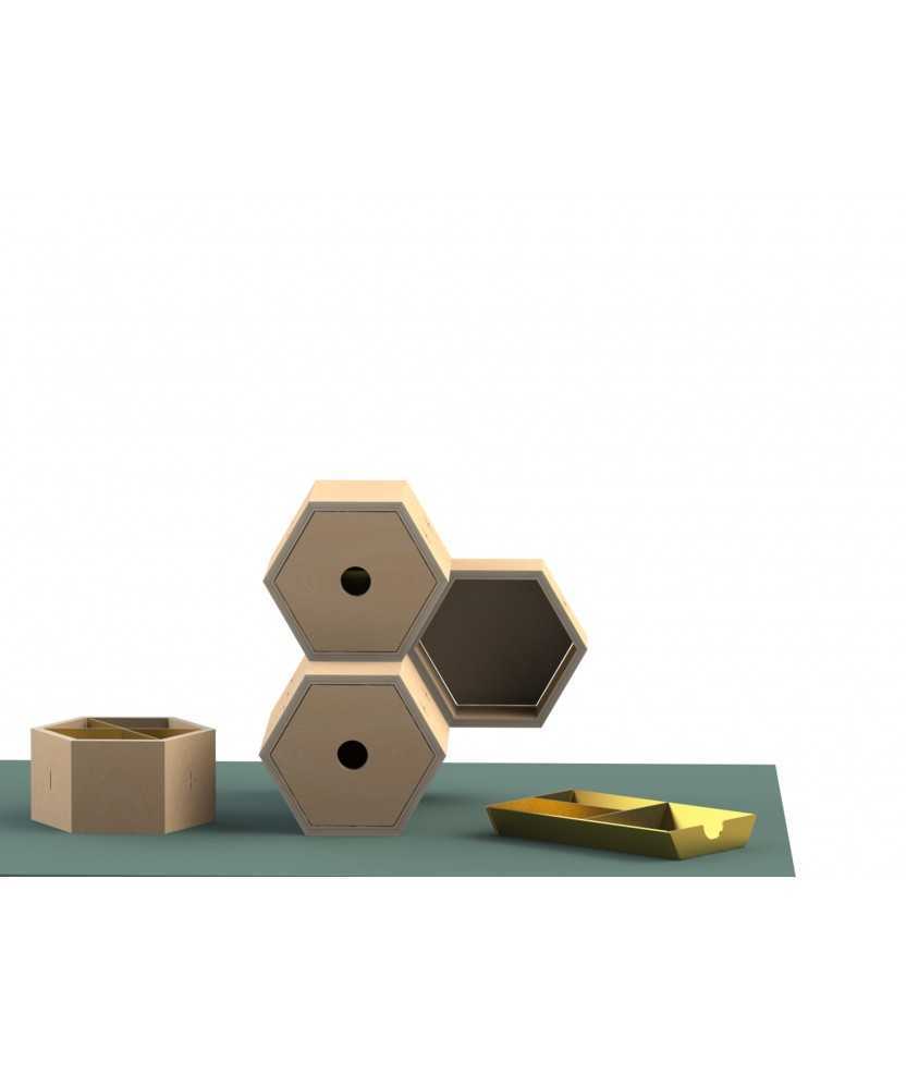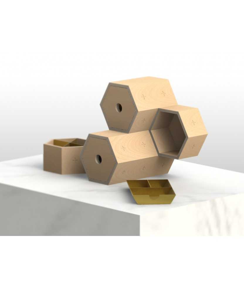 Sistema d'emmagatzematge d'estil modern i pràctic. La col·lecció la formen tres mòduls flexibles que s'adapten a les necessitats de l'usuari ja que permet crear configuracions personalitzades a través de les seves cares imantades. Fabricats en contraxapat de faig i safata interior de llautó. Els mòduls es venen per separat. Mides: 12x10,5x6 cm. Elisava Alumni.