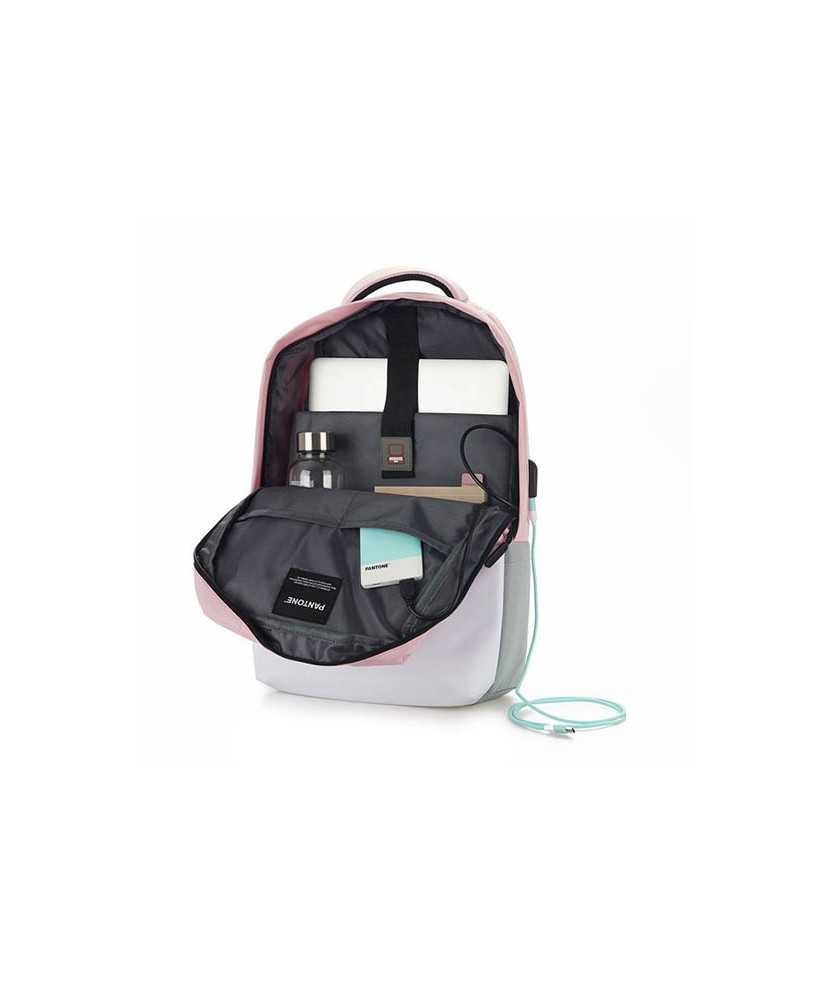 Motxilla amb el disseny inspirat en la guia de colors Pantone, que conté multiples butxaques: una exterior amb cremallera, 2 petites interiors i una separació encoixinada per al portátil (fins a 15,6'). Molt comòda de portar, les tires s'adjusten per alleugerar les espatlles i l'esquena. A més, inclou un cable USB i un connector per poder conectar una bateria. Mides: 44x30x12 cm.