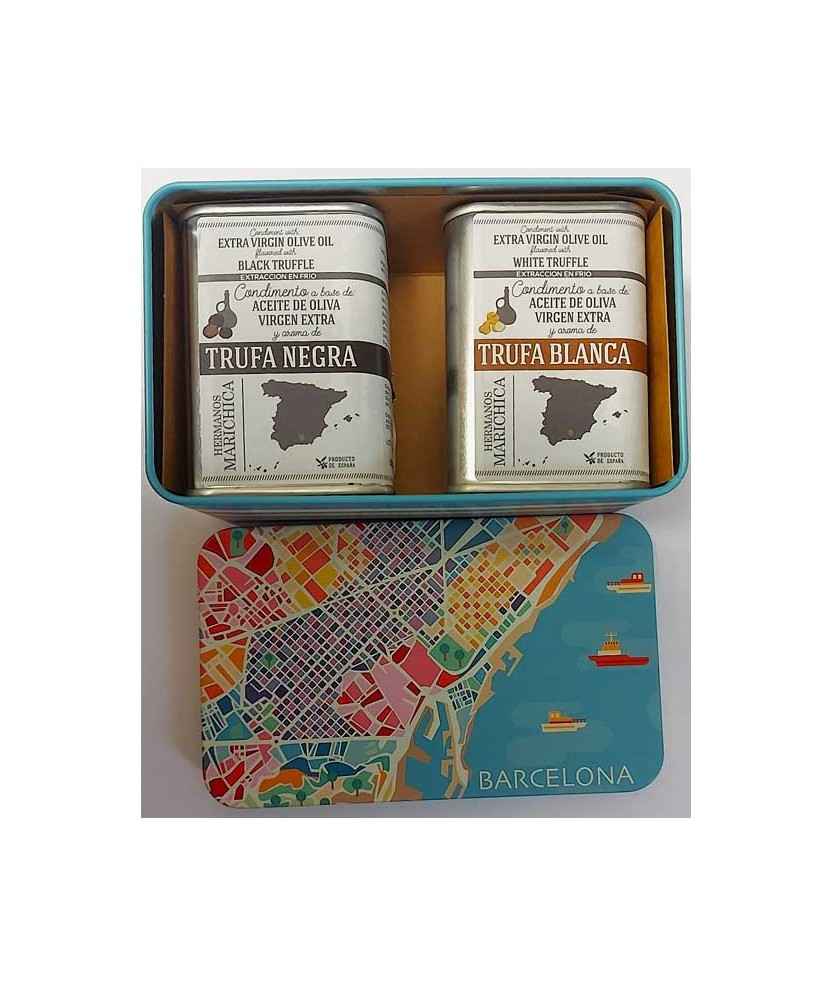Llauna metàl·lica amb un duo d'olis: 100 ml d'oli de tòfona blanca i oli de tòfona negra. Presenta colors variats amb predomini del blau i conserva les aromes i la qualitat dels olis. Ideal per afegir un toc gurmet a plats i amanides amb sabor intens i elegant. Pes total amb envàs: 410 g. Mides: 154 x 94 x 62 mm.