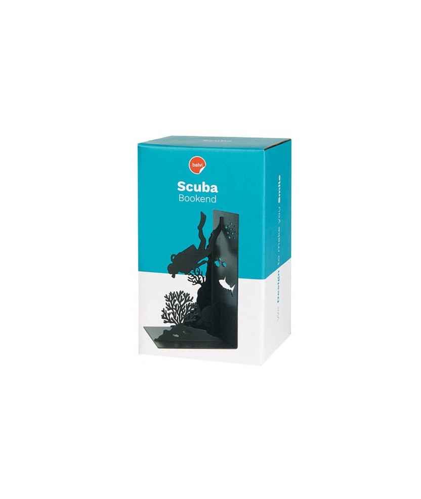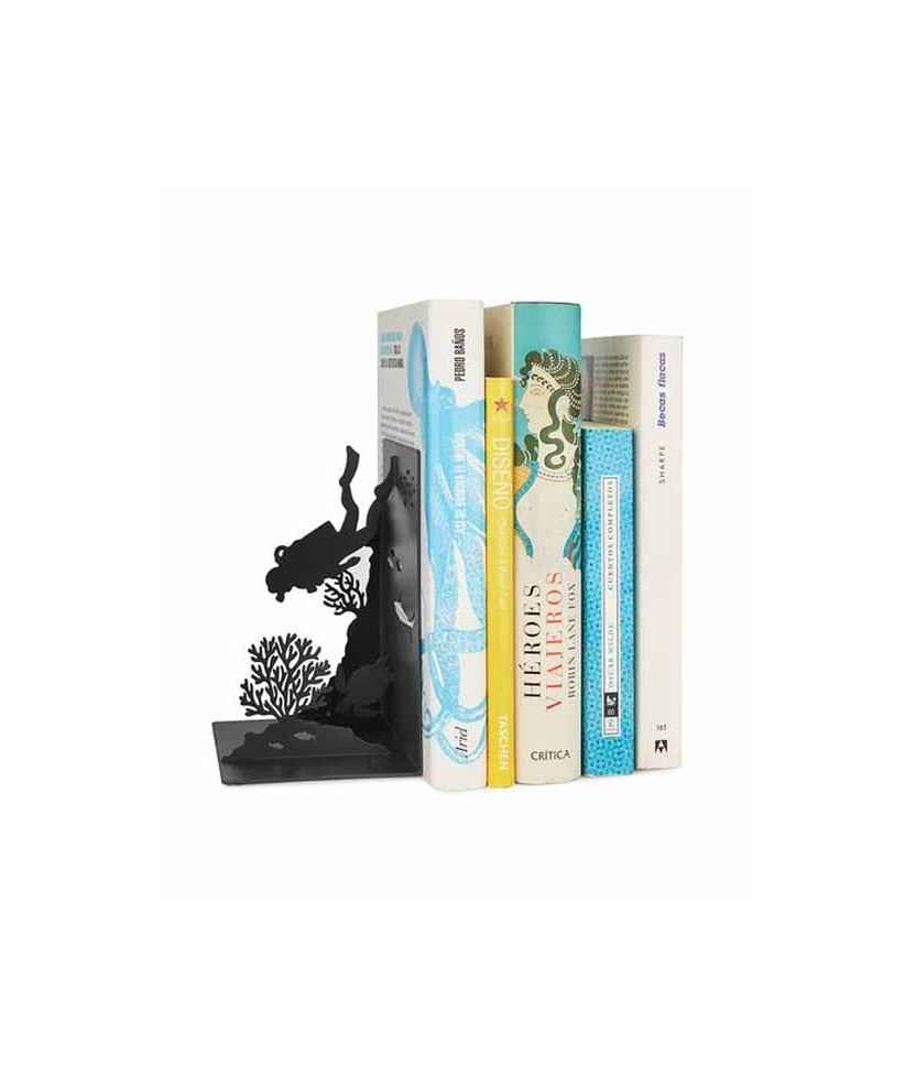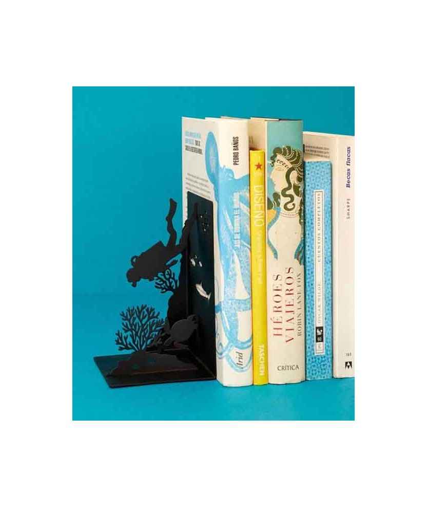 Subjectallibres en forma de submarinista que simula les profunditats de l'oceà. Fabricat en metall resistent amb punts de suport antilliscants, protegeix els llibres de caigudes i manté l'espai ordenat. Disseny original i pràctic, ideal per a amants del món marí, bussejadors i aficionats, aportant un toc decoratiu a la biblioteca, habitació o oficina. Mides: 16x10x10 cm.