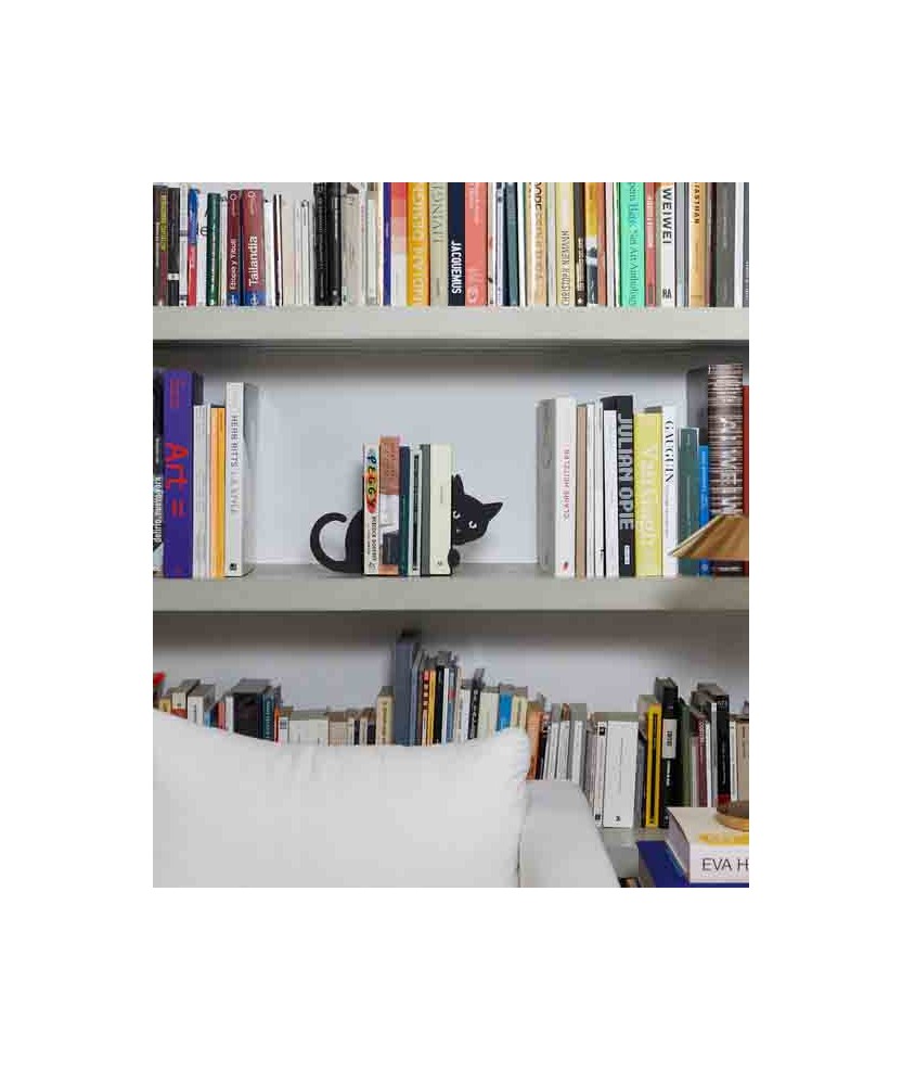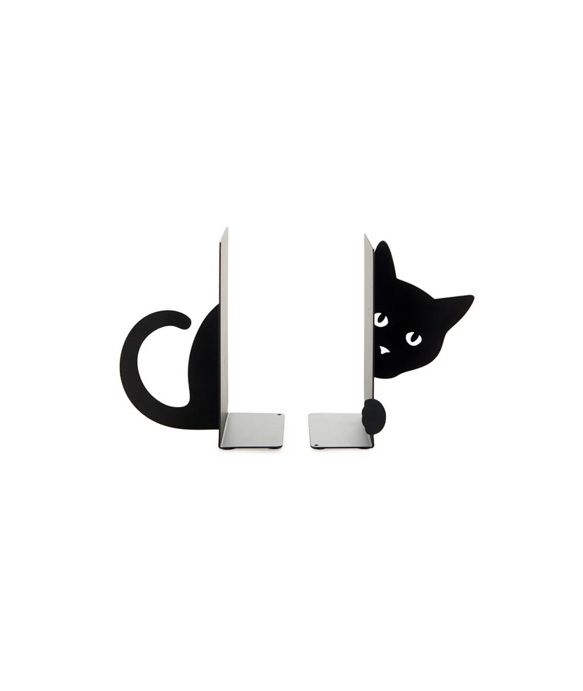 Suport de llibres de dues peces amb disseny de gat que crea la il·lusió d'un felí amagat darrere dels llibres. Fabricat en metall durador amb coixinets antilliscants per garantir estabilitat. Robust i funcional, aporta un toc divertit i personalitat a qualsevol prestatgeria, escriptori o racó de lectura. Ideal per amants dels gats i de la decoració original. Material: metall. Mides: 16x10x13,5 cm.