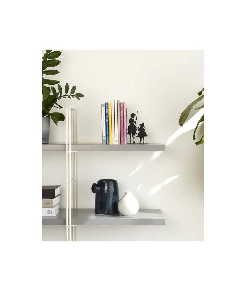 Suport per a llibres Don Quijote elaborat en metall resistent, amb protectors antilliscants i un disseny que representa Don Quijote i Sancho Panza. Una peça funcional i decorativa inspirada en l'obra de Cervantes, ideal per a prestatgeries, escriptoris o racons de lectura. Mesura 17 x 10 x 10 cm.