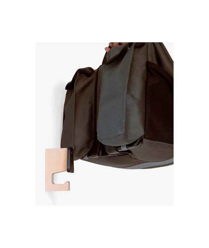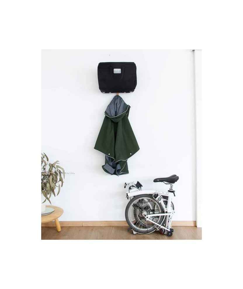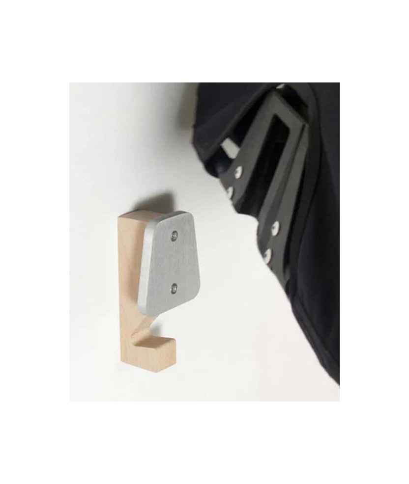 Penjador de paret dissenyat per penjar la bossa del teu Brompton. Per alliberar espai i deixar-ho tot endreçat. Pots penjar la bossa i el casc, la jaqueta, l'impermeable o fins i tot lligar el gos. BromHome-L és la versió dissenyada per adaptar-se millor a les bosses que tenen butxaques del darrere, amb 3 cm més de profunditat. Materials: fusta de faig, alumini anoditzat. Disponible en: plata mat, negre mat i daurat mat. Mides: 12x6,5x4 cm.